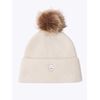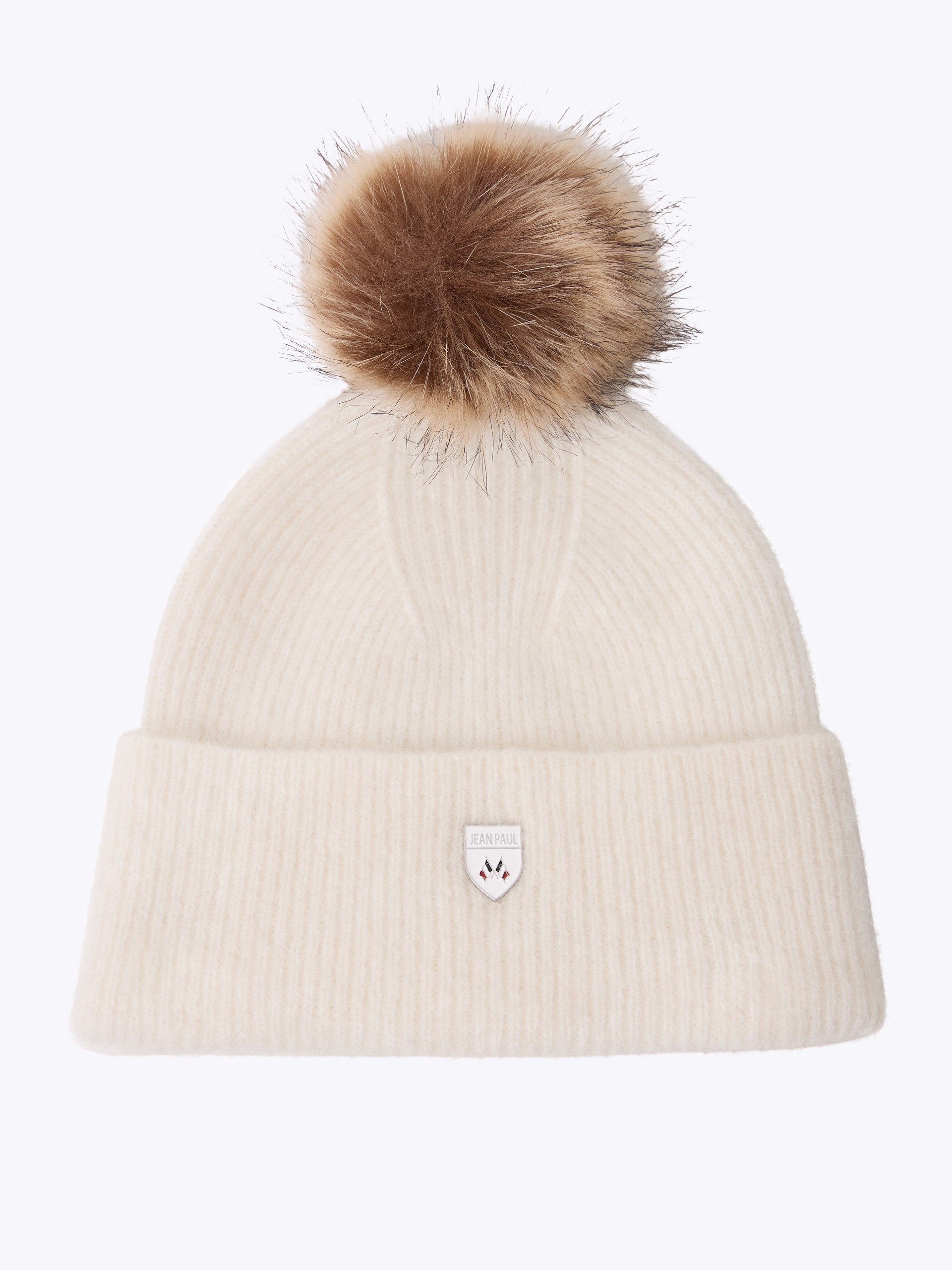 Varm og lun lue i delikat myk ullblanding. Luen har stor dusk i fuskepels, bred oppbrett og en liten metallbadge foran.