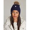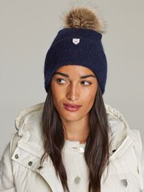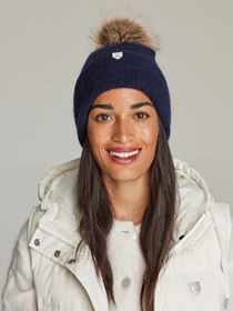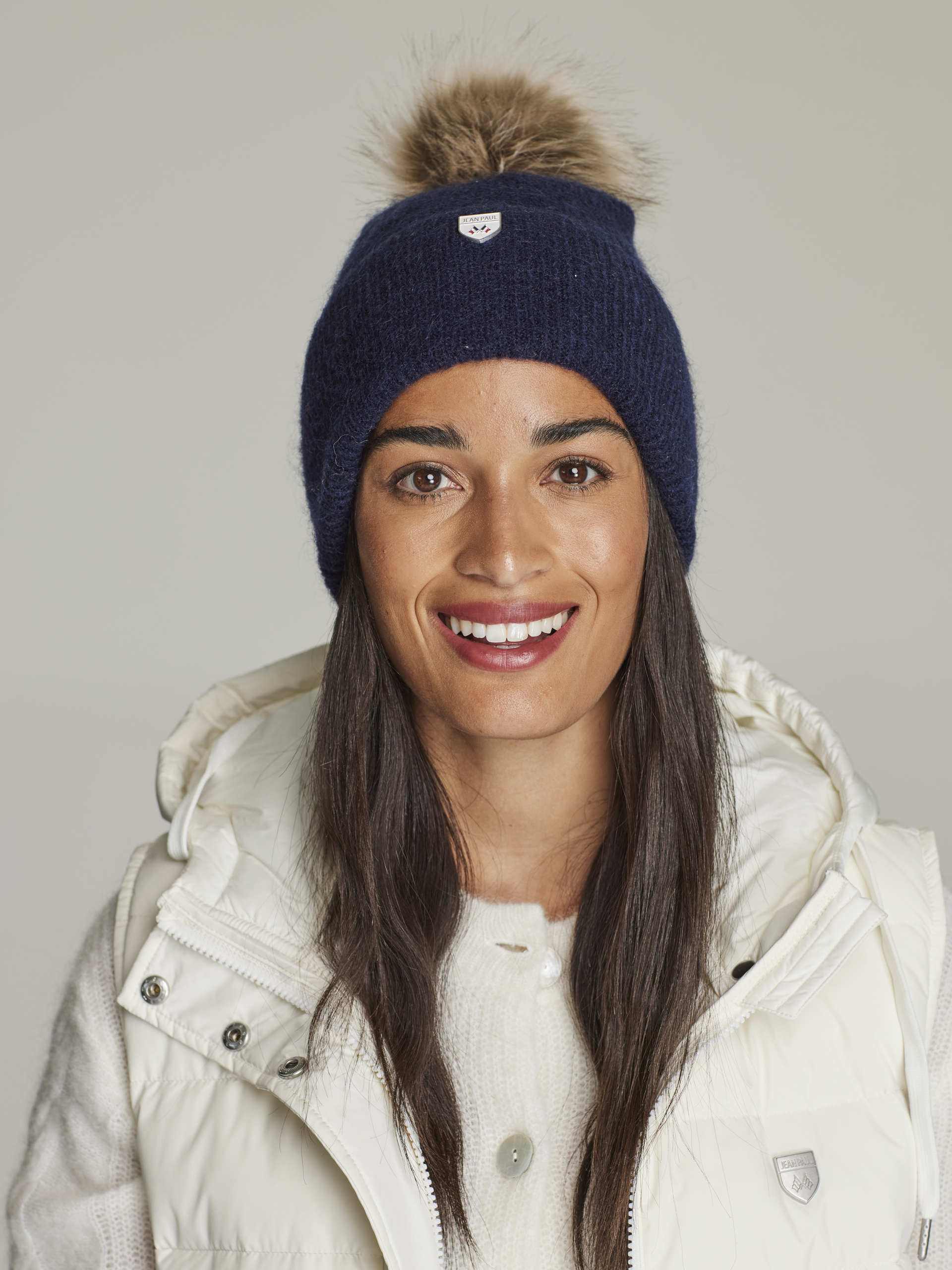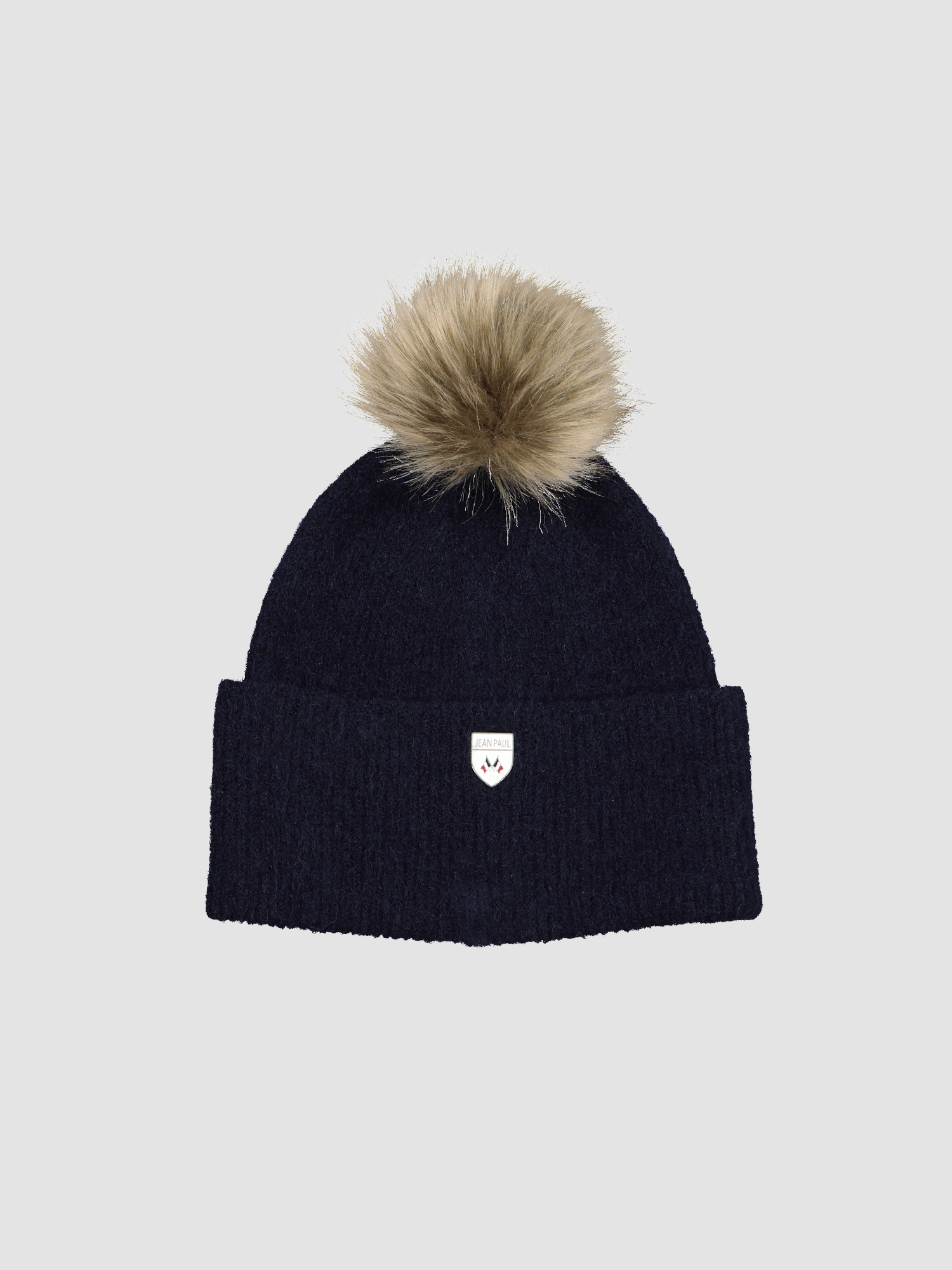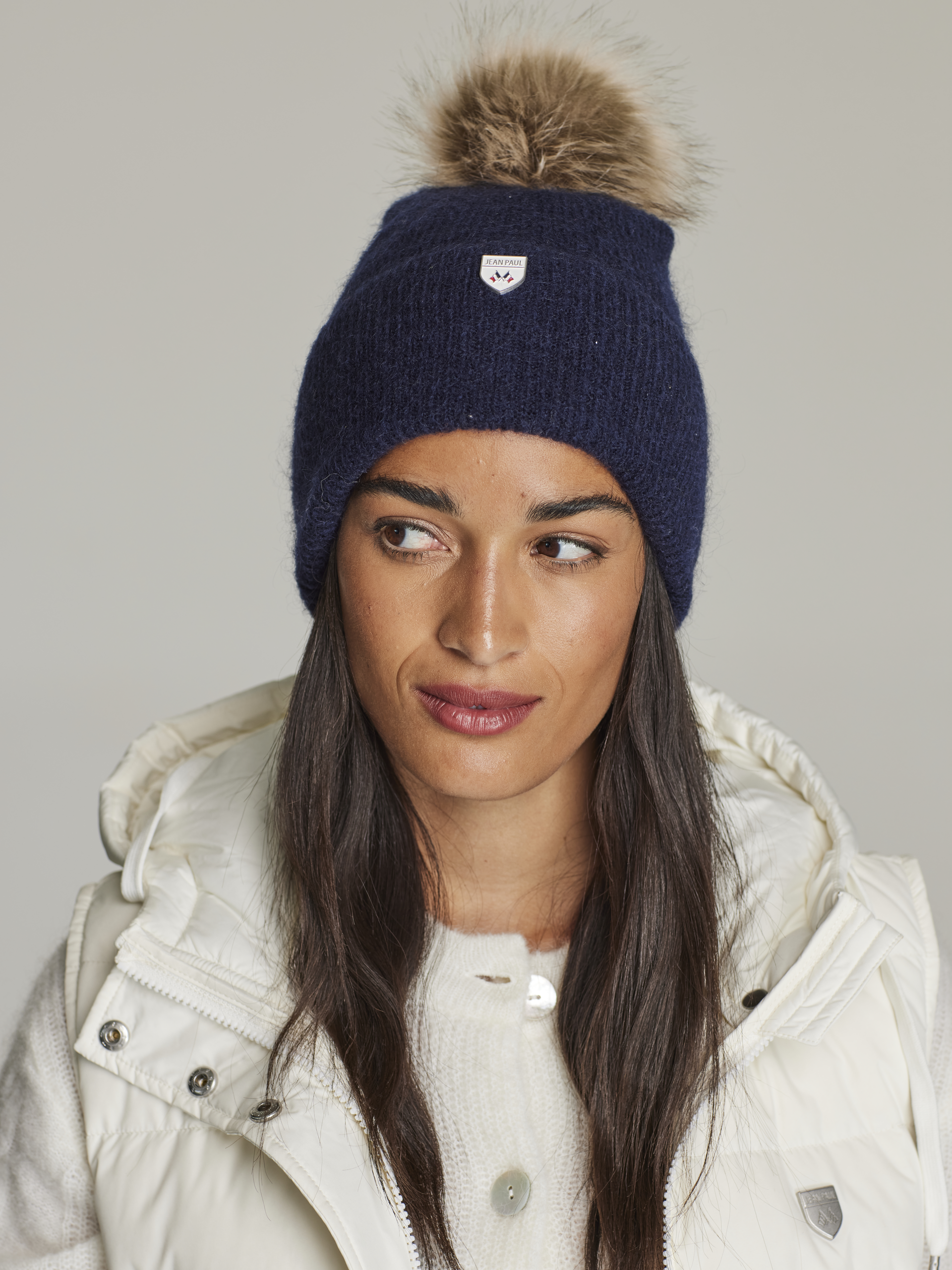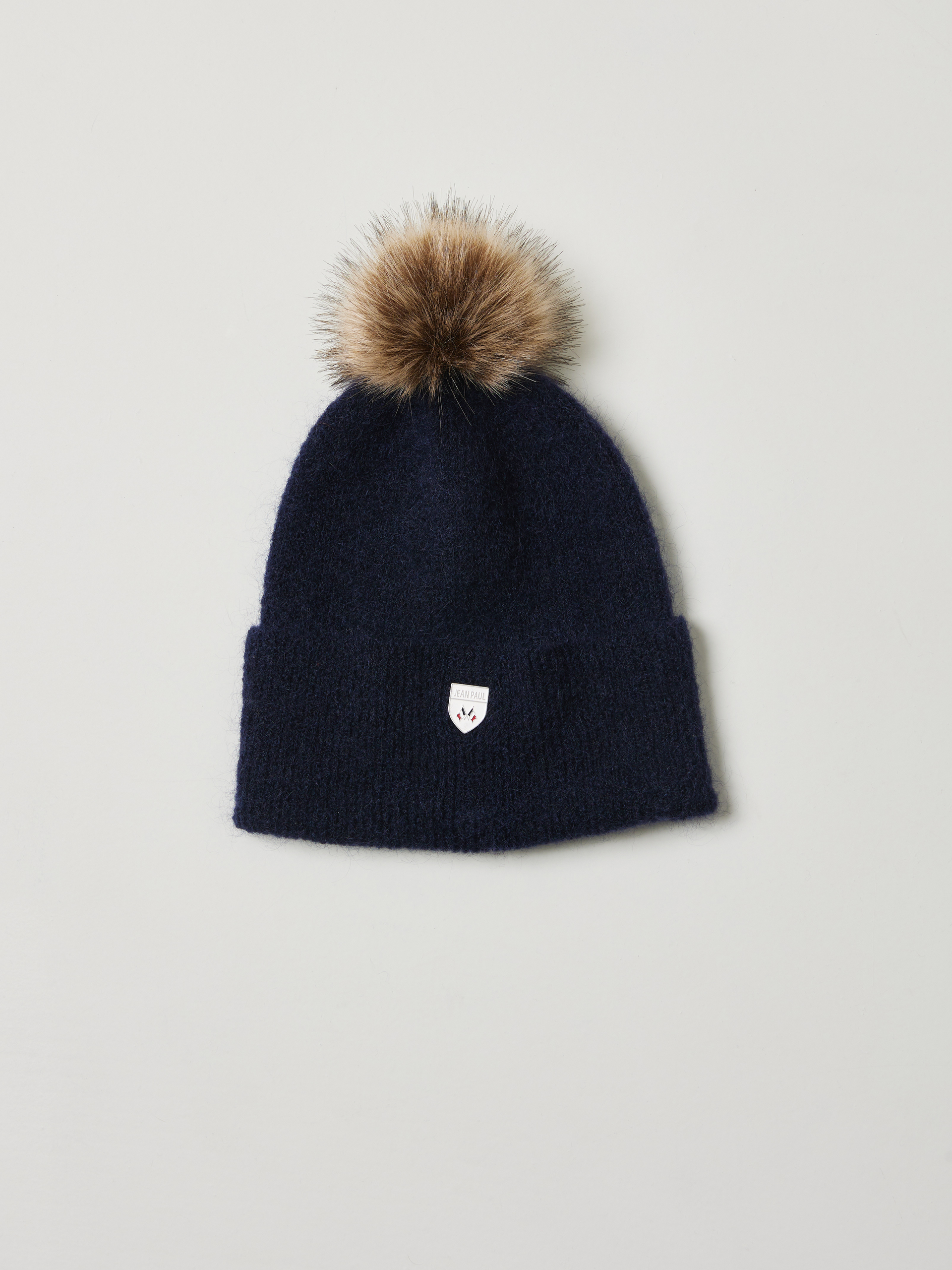 Varm og lun lue i delikat myk ullblanding. Luen har stor dusk i fuskepels, bred oppbrett og en liten metallbadge foran.