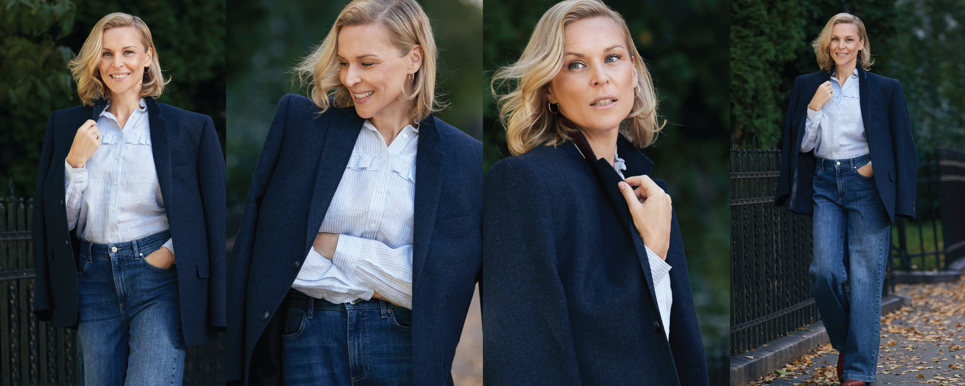 Agnes mørkeblå cardigan, kr 999// Cindy linskjorte, kr 1399 // Nancy Poplin skjorte, kr 999// Sneakers, kr 799 // Camille jeans, kr 1199.