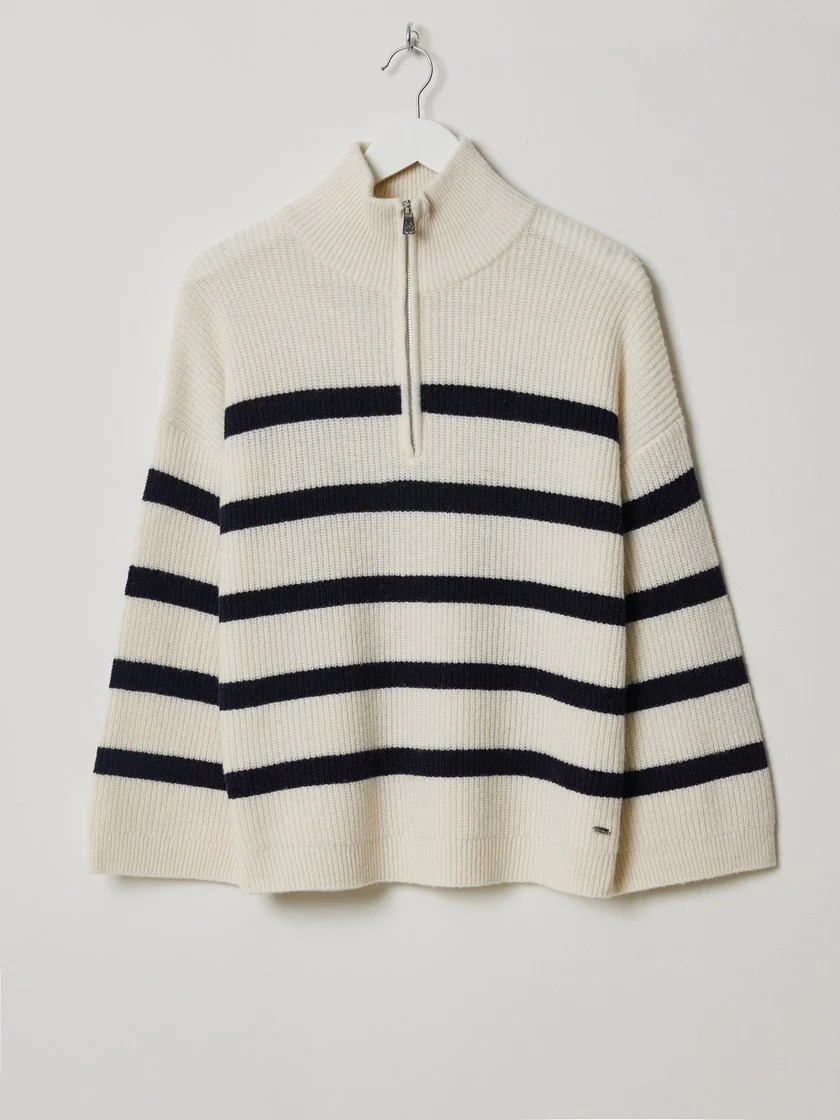 Skap et iøynefallende, men enkelt uttrykk med en klassisk stripete overdel og hvite, flared jeans.