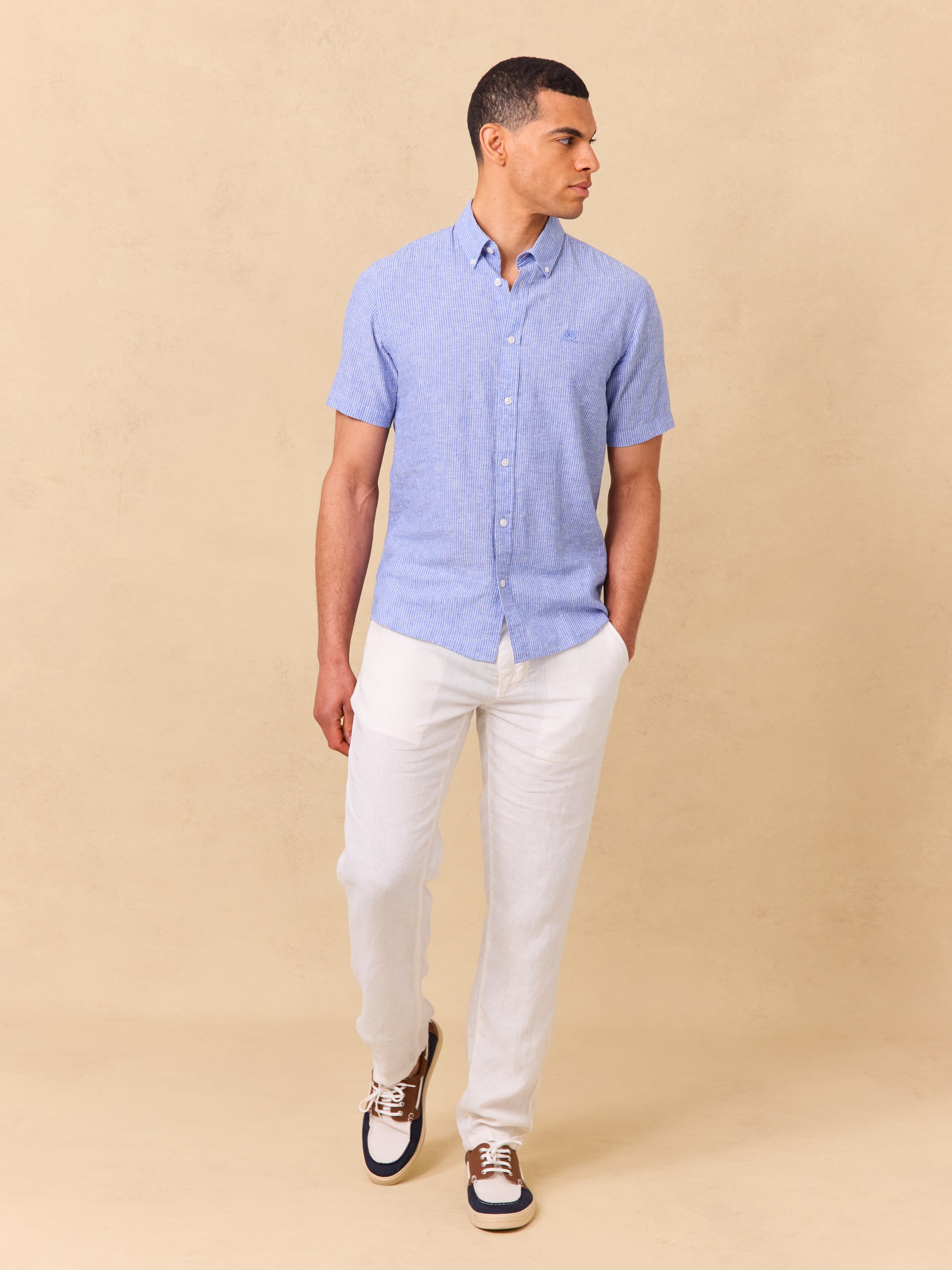 Adrien er en komfortabel bukse i 100% lin, designet med snøring i livet, knapp og glidelåsgylf i front. Buksen har skrålommer foran og passepoilerte lommer bak, samt brune knapper og subtile kontrastdetaljer. Regular fit passform med avsmalende ben, normal livhøyde og setevidde.