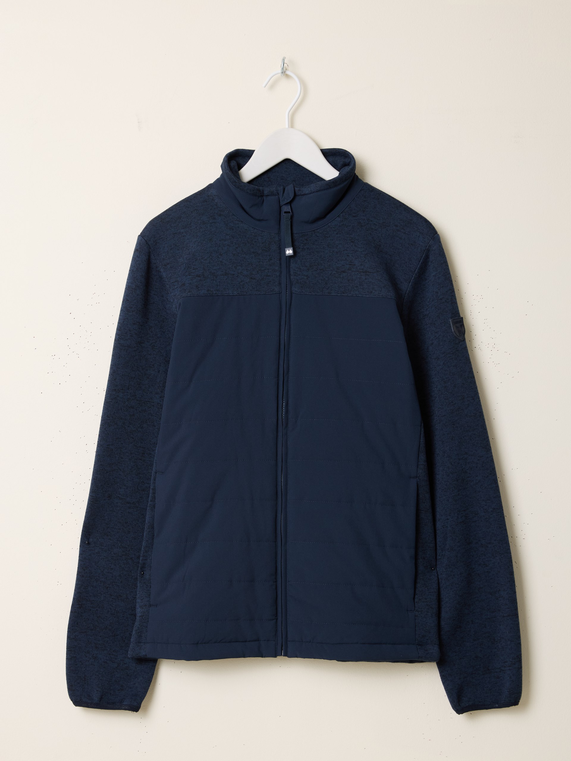 Jakke i kombinerte stoffkvaliteter med vattert front og bakstykke i vevet kvalitet, samt strikket stoff i sidene, ermene og på kragen.