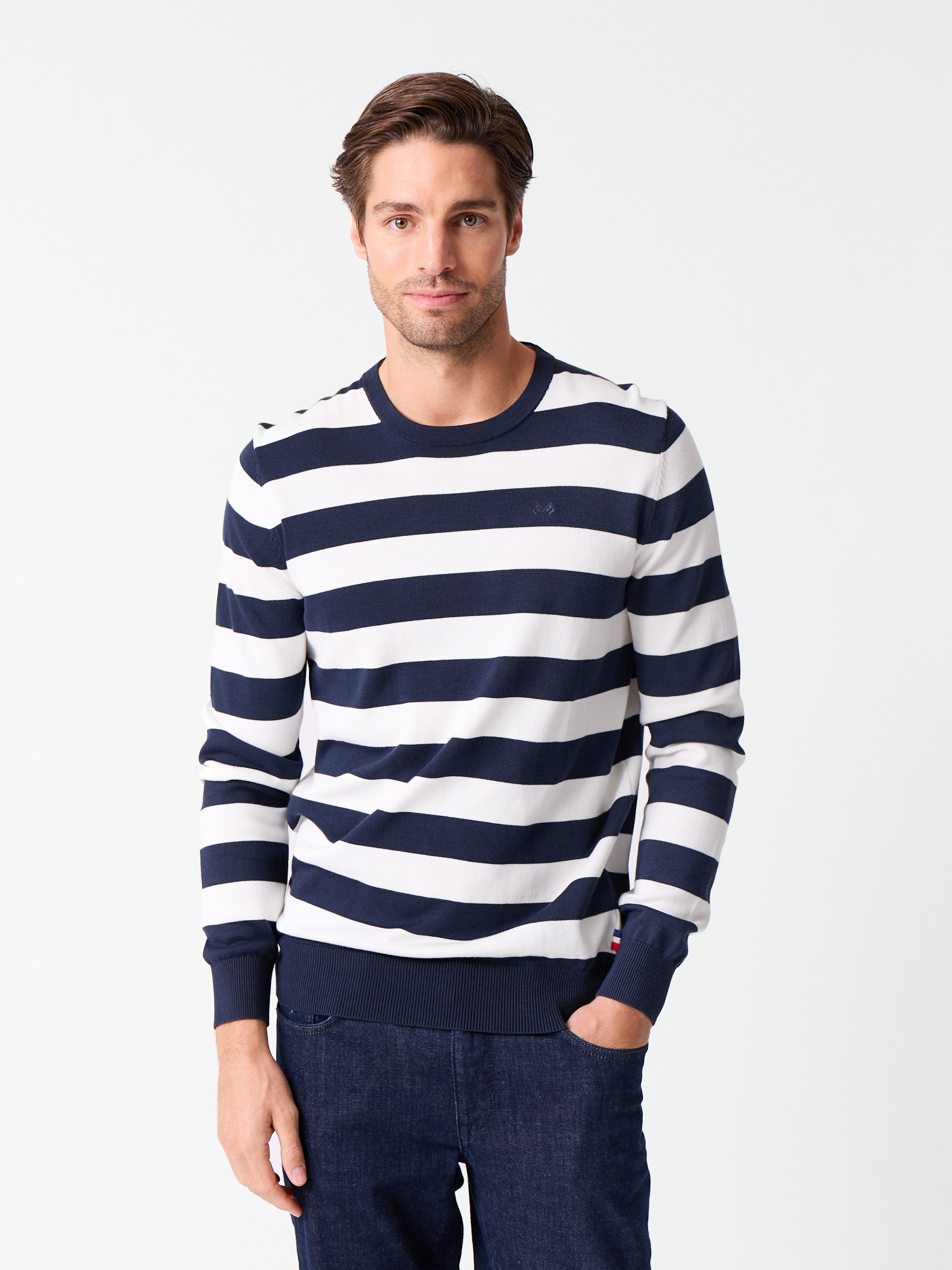 Klassisk finstrikket stripet genser i behagelig 100% økologisk bomull.