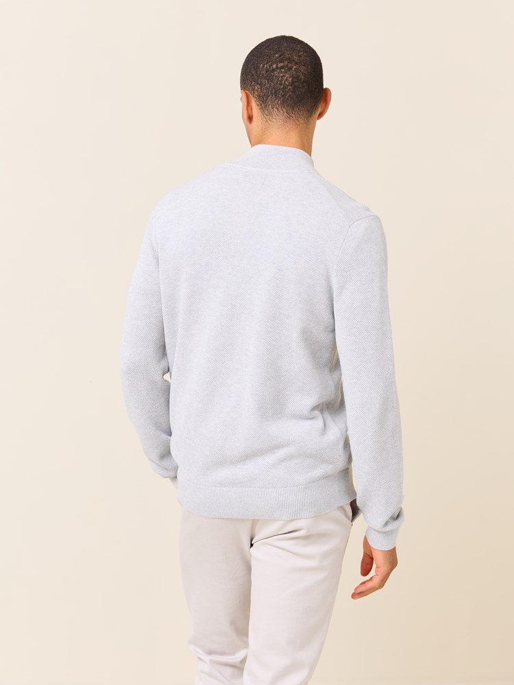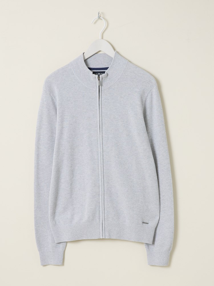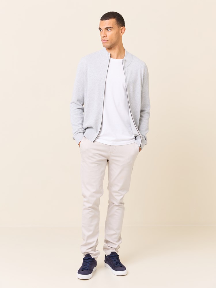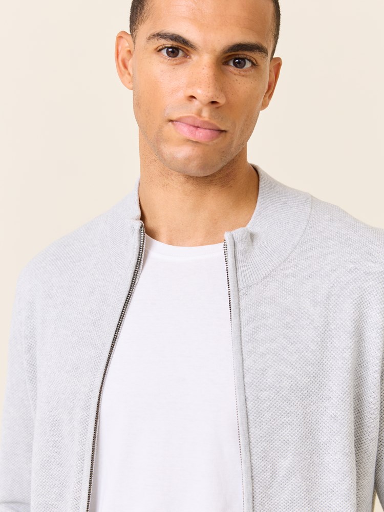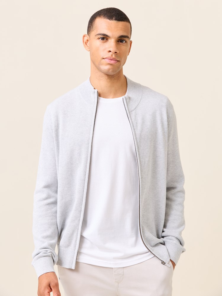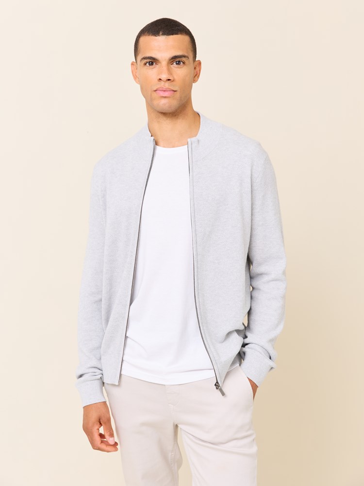 Lett cardigan i finstrukturert strikk av økologisk bomull med logotert metallglidelås i front. Cardiganen har en liten metallbadge med logo nede på siden samt ribbestrikket krage og vrangborder. Klassisk passform. Modellen er 185 cm høy og har på seg str L.