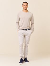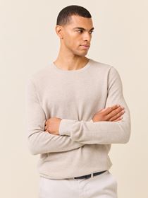 Lett genser i finstrukturert strikk av økologisk bomull med rund hals og innvendig kontrasttape i nakken . Genseren har en liten metallbadge med logo nede på siden og ribbestrikkede vrangborder. Klassisk passform. Modellen 185 cm høy og har på seg str L.