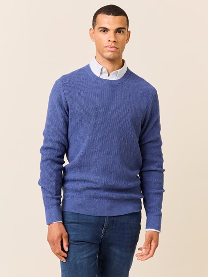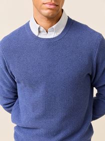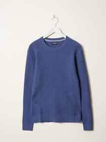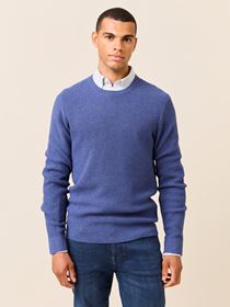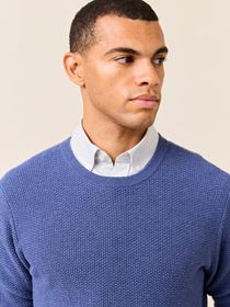 Strukturstrikket genser i 100% økologisk bomull. Genseren har ribbestrikkede vrangborder og en liten logo nede på siden. Klassisk passform. Modellen er 185 cm og har på seg str M.