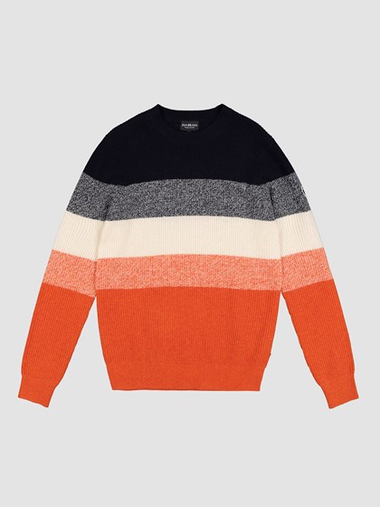 Klassisk blokkstripet ribbestrikket genser i 80% lammeull og 20% forsterkende nylon. Genseren har rund hals med god vrangbord, logobadge på ermet og en liten flaggtab i siden. Modellen er 187 cm høy og bruker str L.