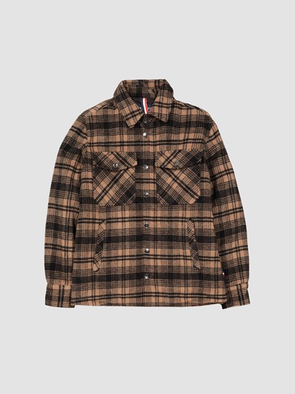 Lun og komfortabel rutet skjortejakke i kraftig ullkvalitet med isolerende lett vattering. Jakken har krage og logotrykknapper i front, gode stiklommer og brystlommer med klaff og knapp, knappet mansjett og en liten logobadge i metall på ermet. Innvendig tricolorefarge hempe i nakken og buet avslutning nederst. Modellen er 187 cm høy og bruker str L.