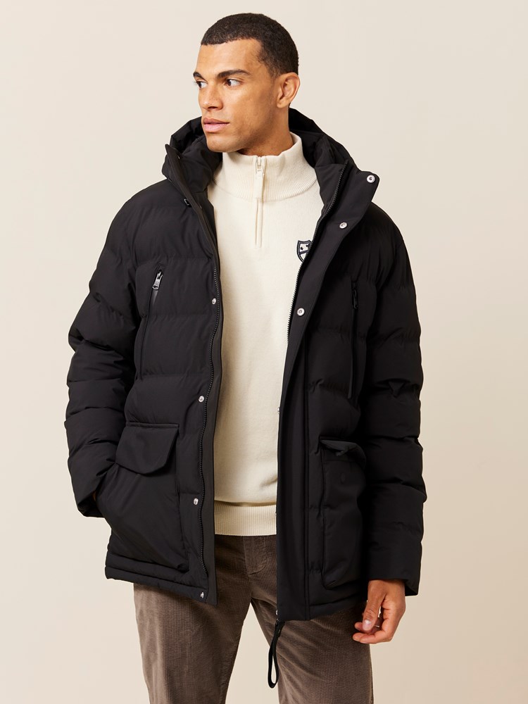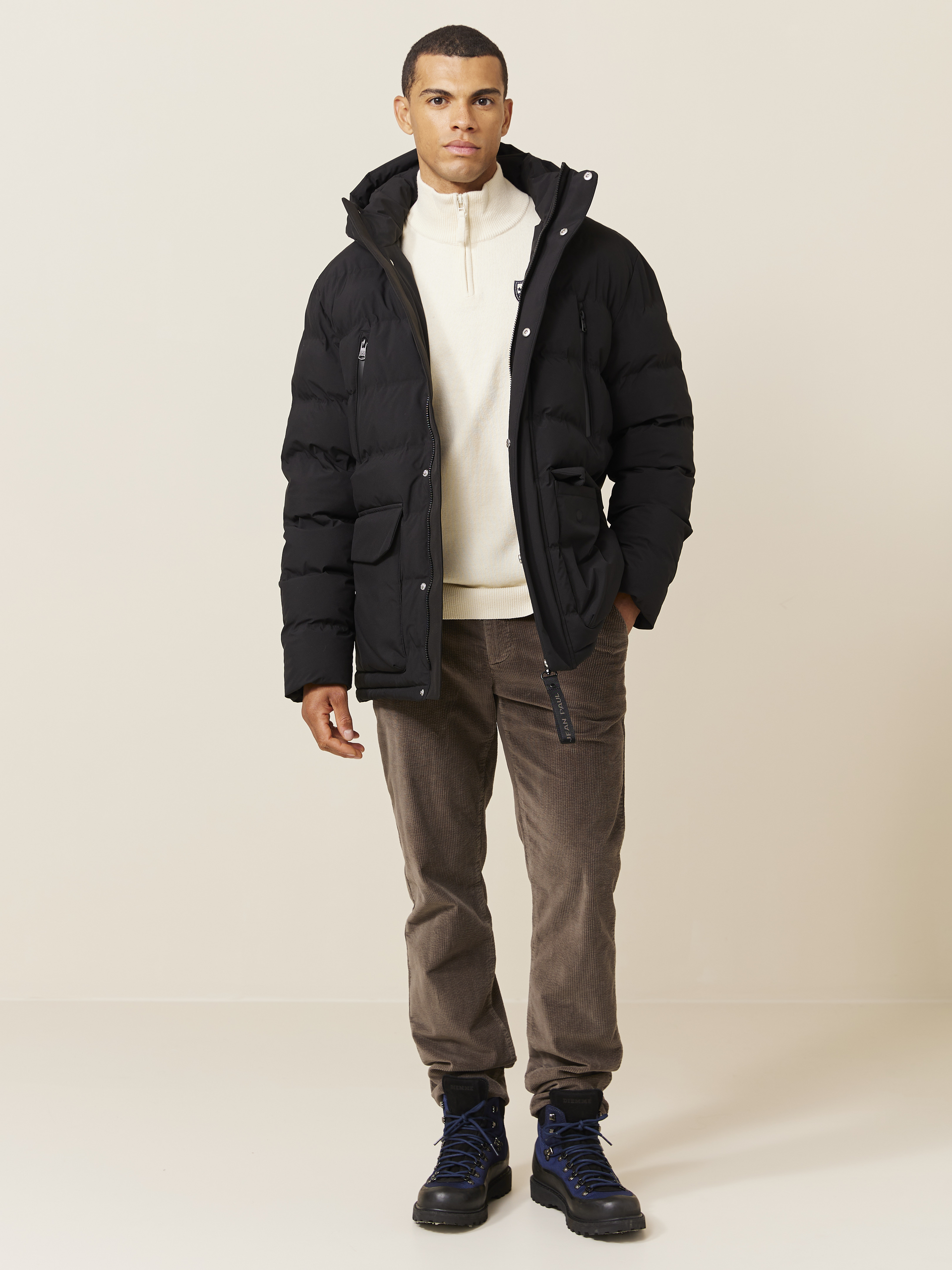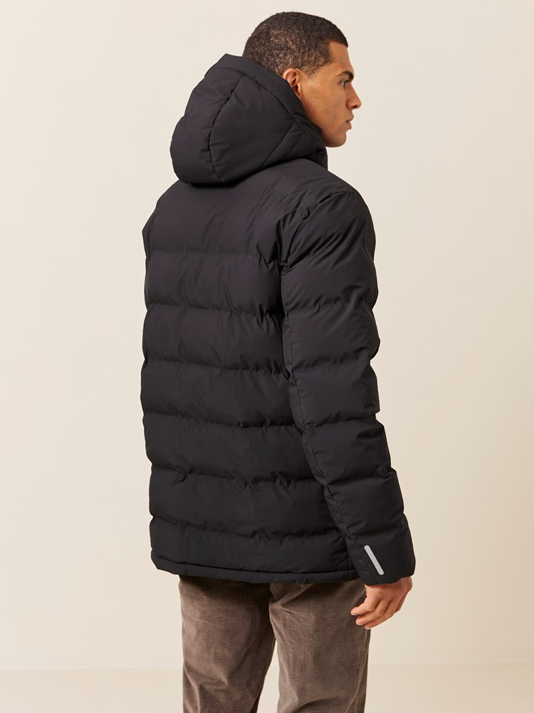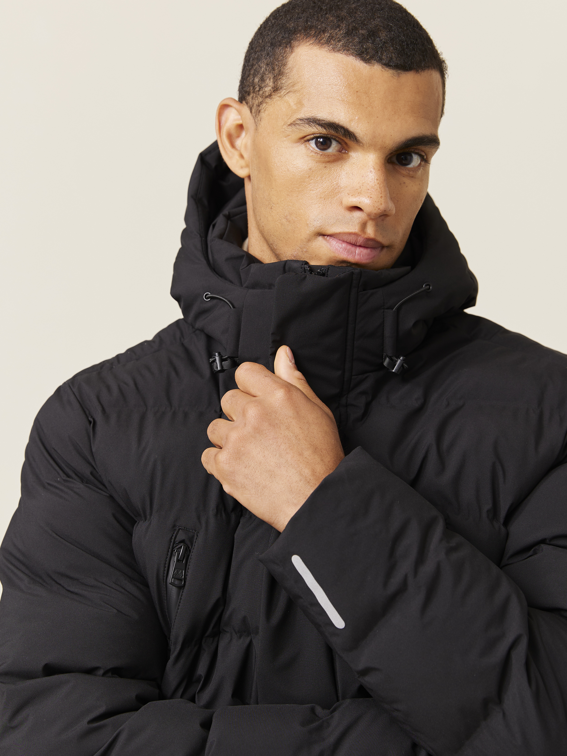 Lun og varm jakke av 100% resirkulert polyestermateriale i ytterstoffet, fôret og den behagelig isolerende vatteringen. Jakken har mykt ytterstoff med mekanisk stretch, hette med regulering, og innvendig krage, svarte kontrastdetaljer, skrå lommer med gummierte glidelåser, doble frontlommer med magnetisk knappet klaff og innstikk, nedfellbare refleksdetaljer i sidene, refleks på ermet, innvendig elastisk mansjett, og god innerlomme med glidelås. Liten tricolorefarget tab i siden og god nakkehempe. Lukkes i front med glidelås med avtagbar glidelåspuller og skjulte trykknapper. Modellen er 185 cm høy og har på seg str L.