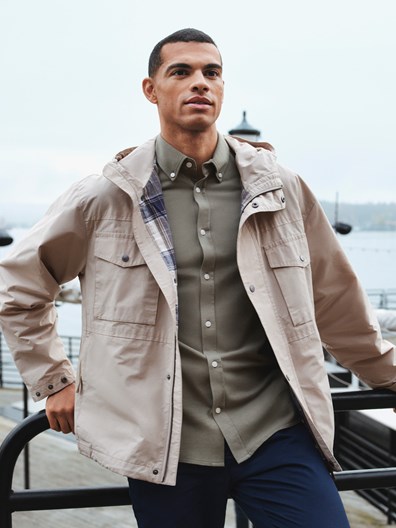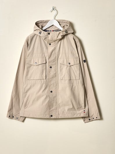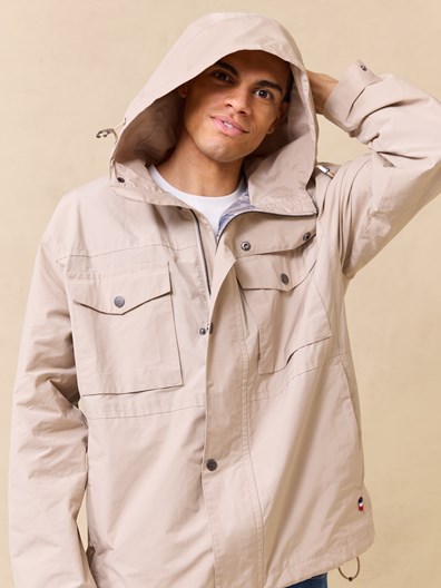 Avslappet fritidsjakke i bomull og polyesterblanding med innvendig rutet fôr i myk kvalitet. Jakken har hette med snøring , 4 gode lommer i front, innerlomme, regulerbar mansjett på ermet og regulering i kanten nede. Liten logobadge på ermet og tricolorefarget tab i siden. Klassisk passform. Modellen er 185 cm høy og har på seg str L.