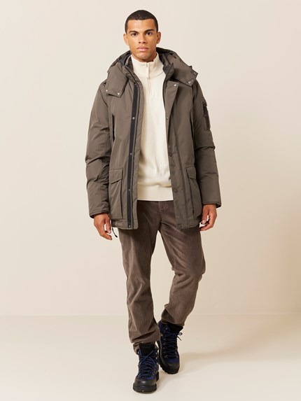 Urban vindtett og vannavstøtende dunparkas med tapede sømmer på utsatte steder. Dunjakken med 100% resirkulert polyester i ytterstoff og fôr har god hette med mykt flanellfôr, og ton i ton loogo på hettekanten. Flere funksjonelle lommer, praktiske splitter i sidene med glidelås og meshfôr og tøff logobadge på overerm. Modellen er 185 cm høy og har på seg str L.