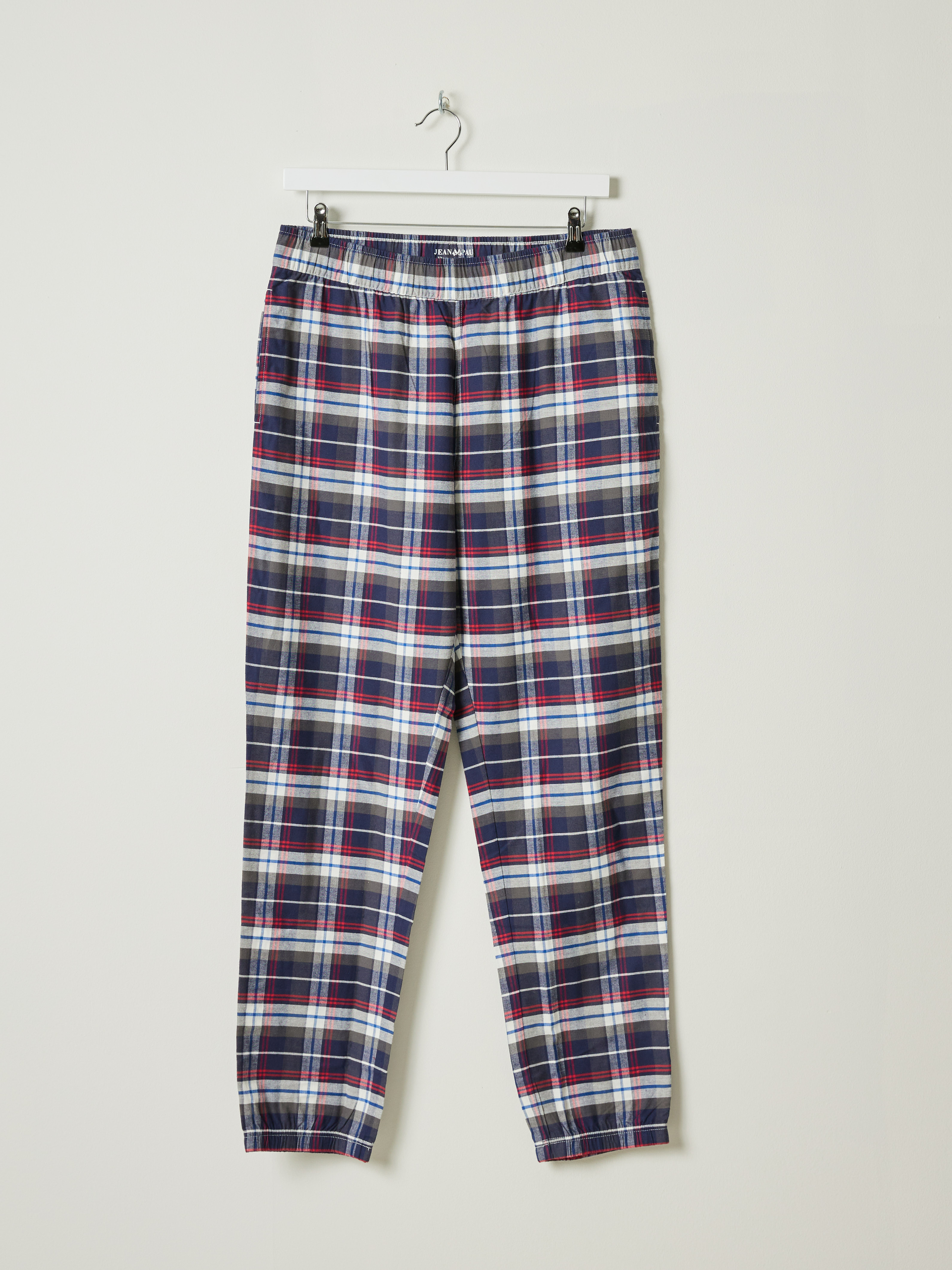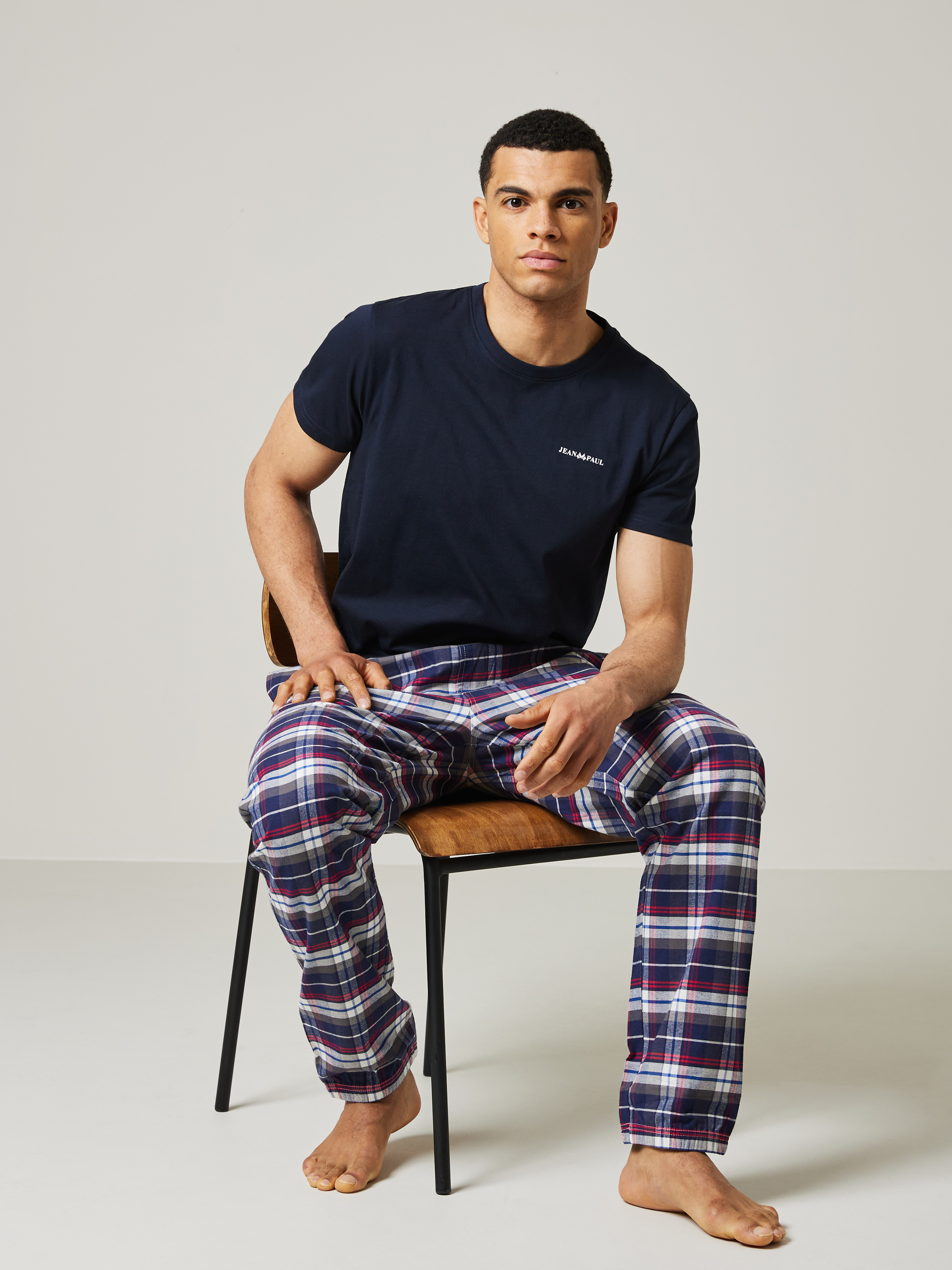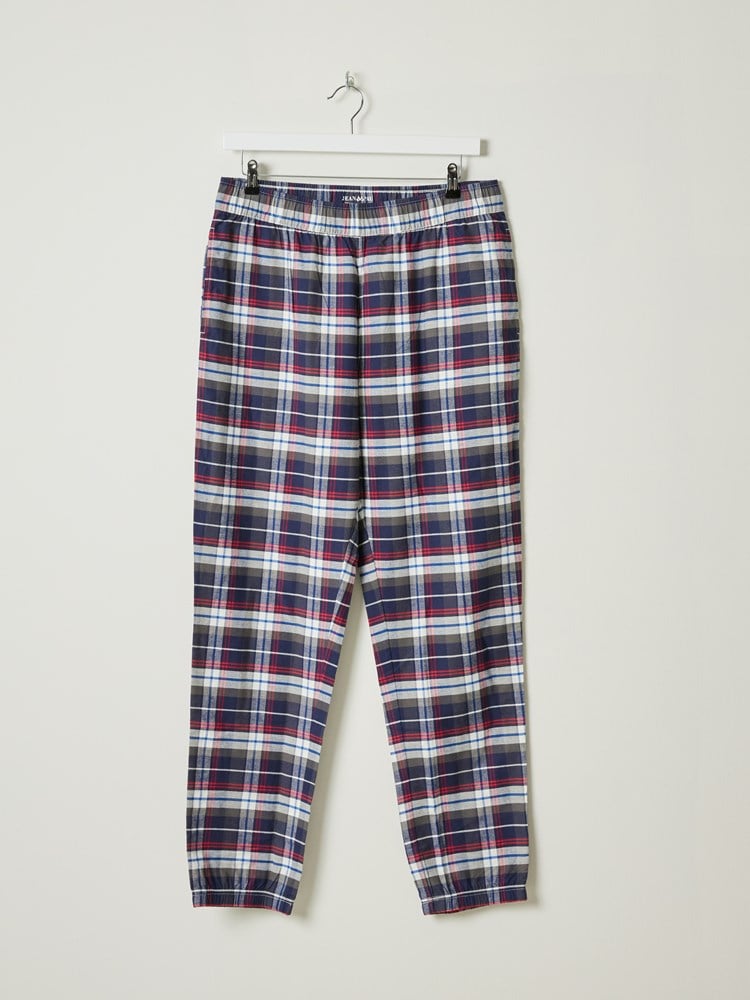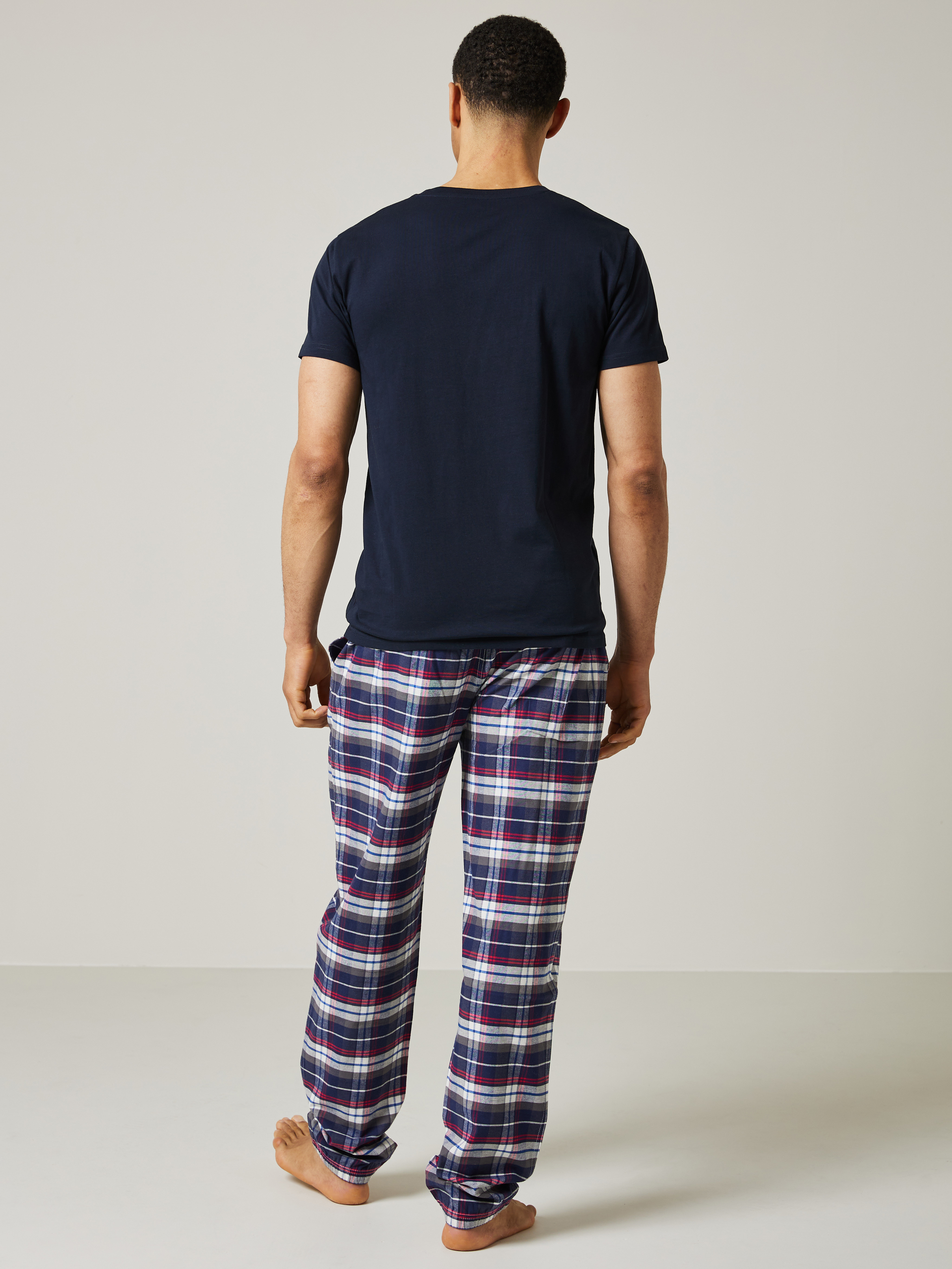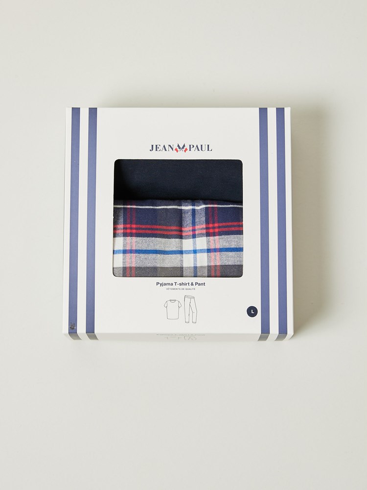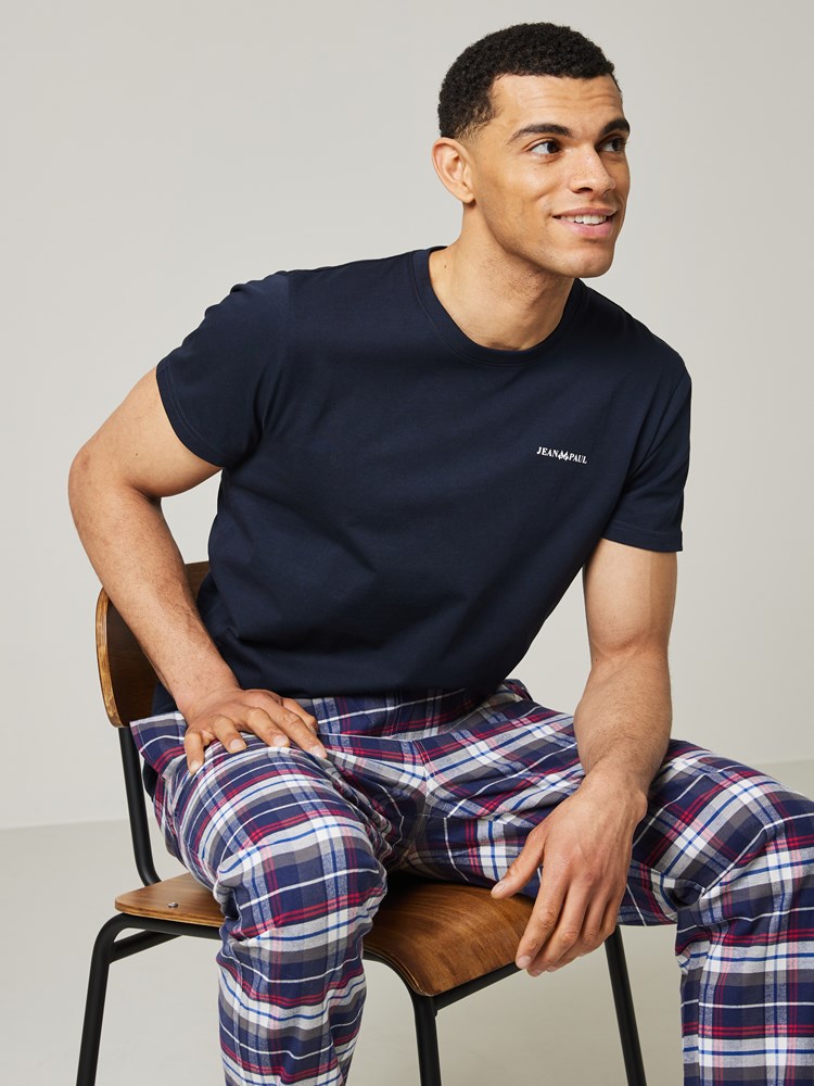Pysjamassett med rutete bukse som har stikklommer og elastikk i livet og nederst i bena. T-skjorten er i myk bomull med kort erm, rund hals og har en liten printet logo på brystet. Modellen er 185 cm høy og bruker str L.