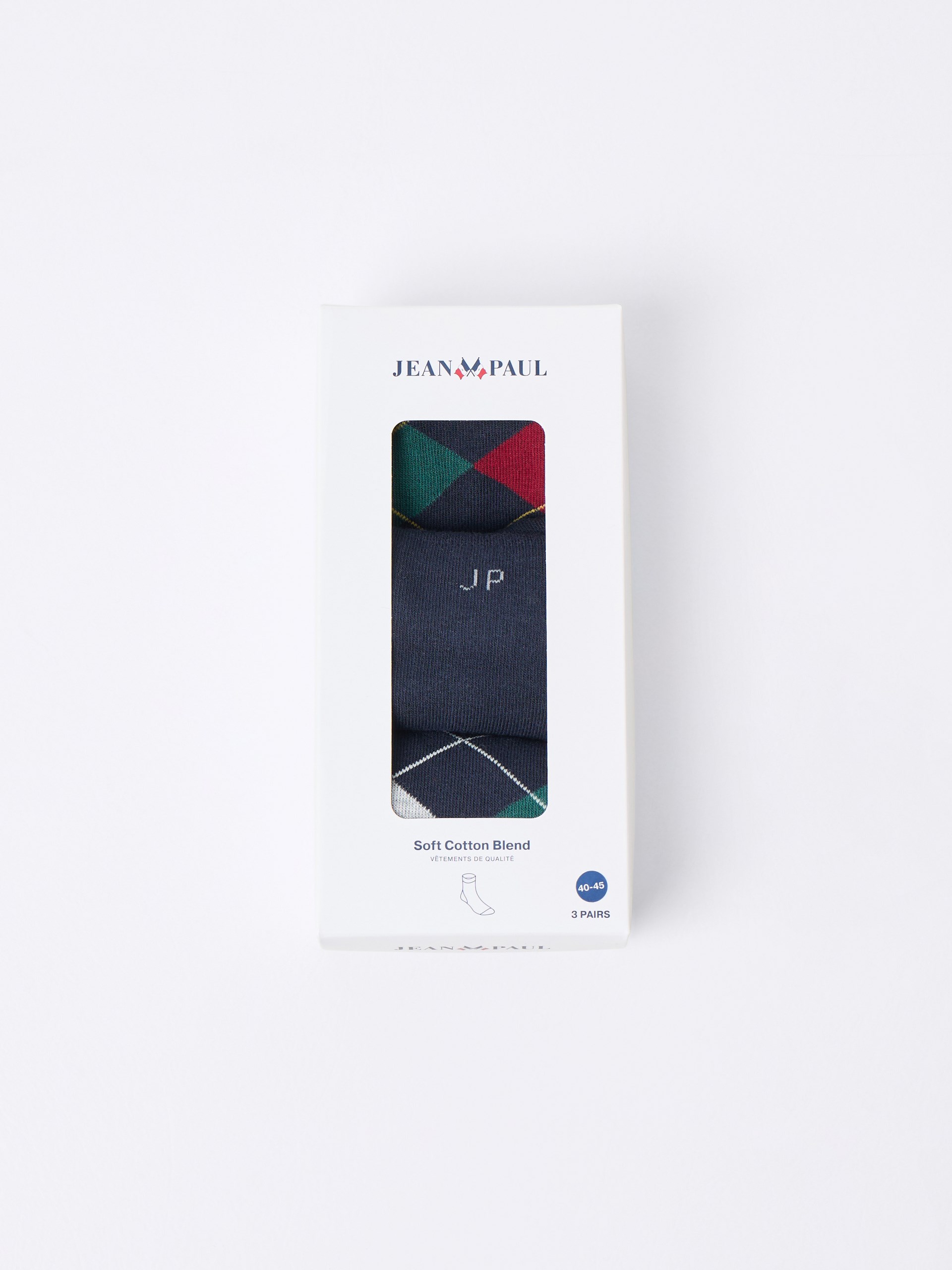 3 pk sokker i behagelig bomullsblanding. Sokkene kommer i en lekker gaveeske og har to mønstrede og en ensfarget variant.