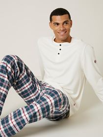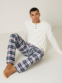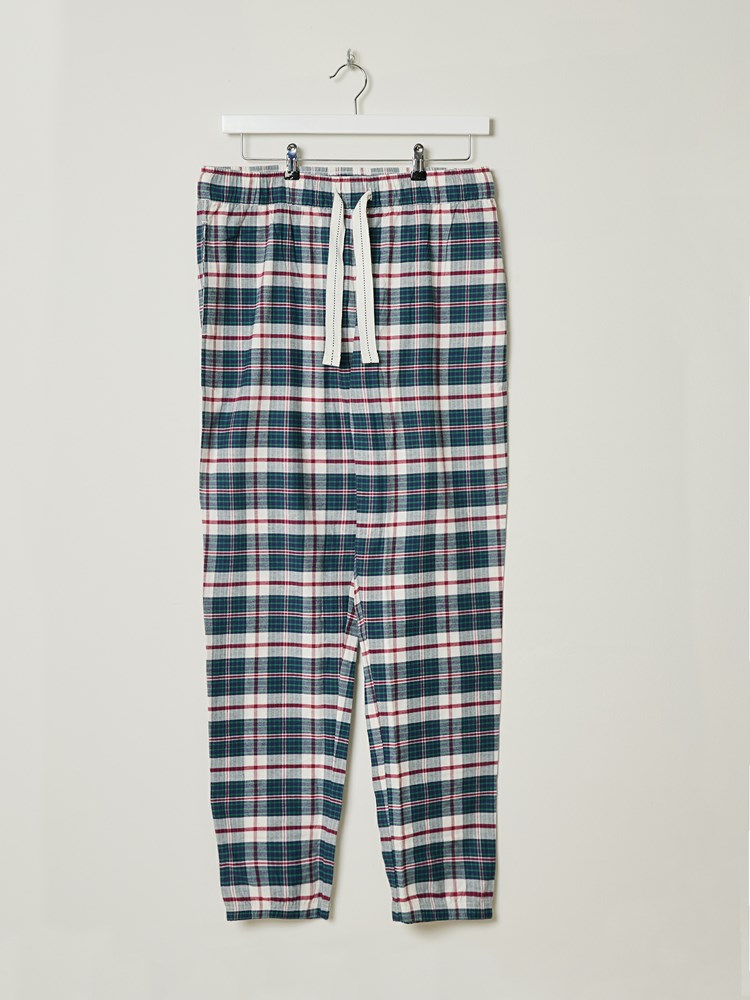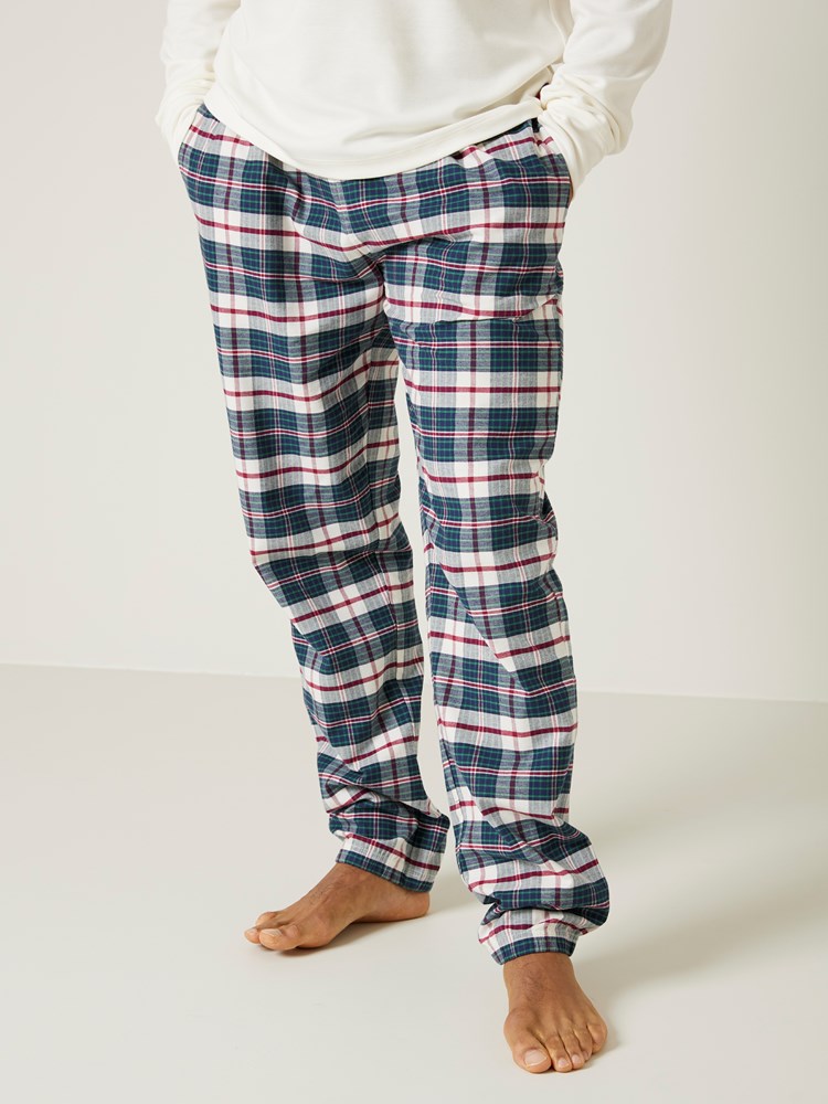 Komfortabel rutet pysjamasbukse i børstet bomull. Pysjamasbuksen har elastikk og snøring i livet, baklomme, normal livhøyde og rette ben. Modellen er 185 cm høy og bruker str L.