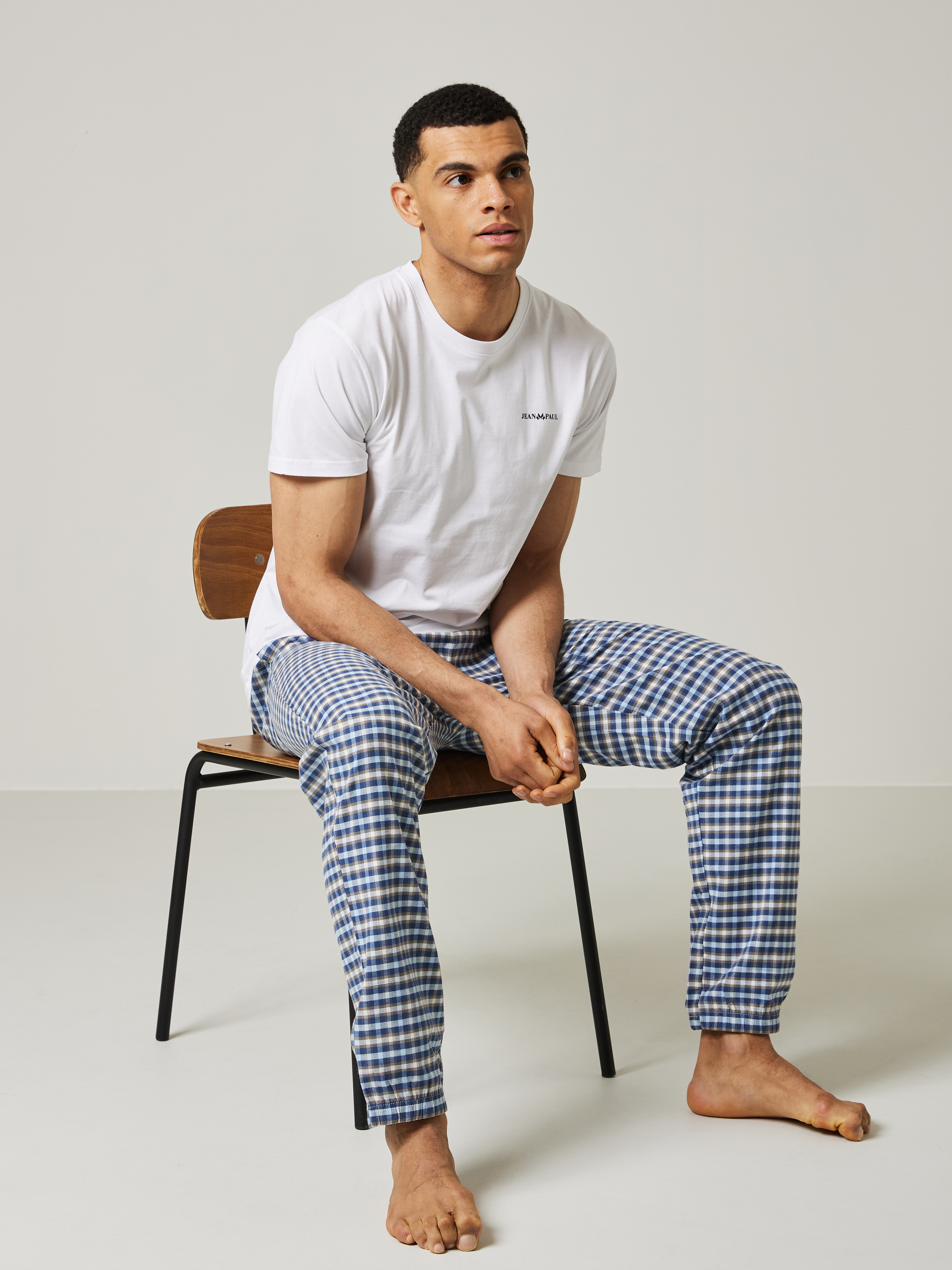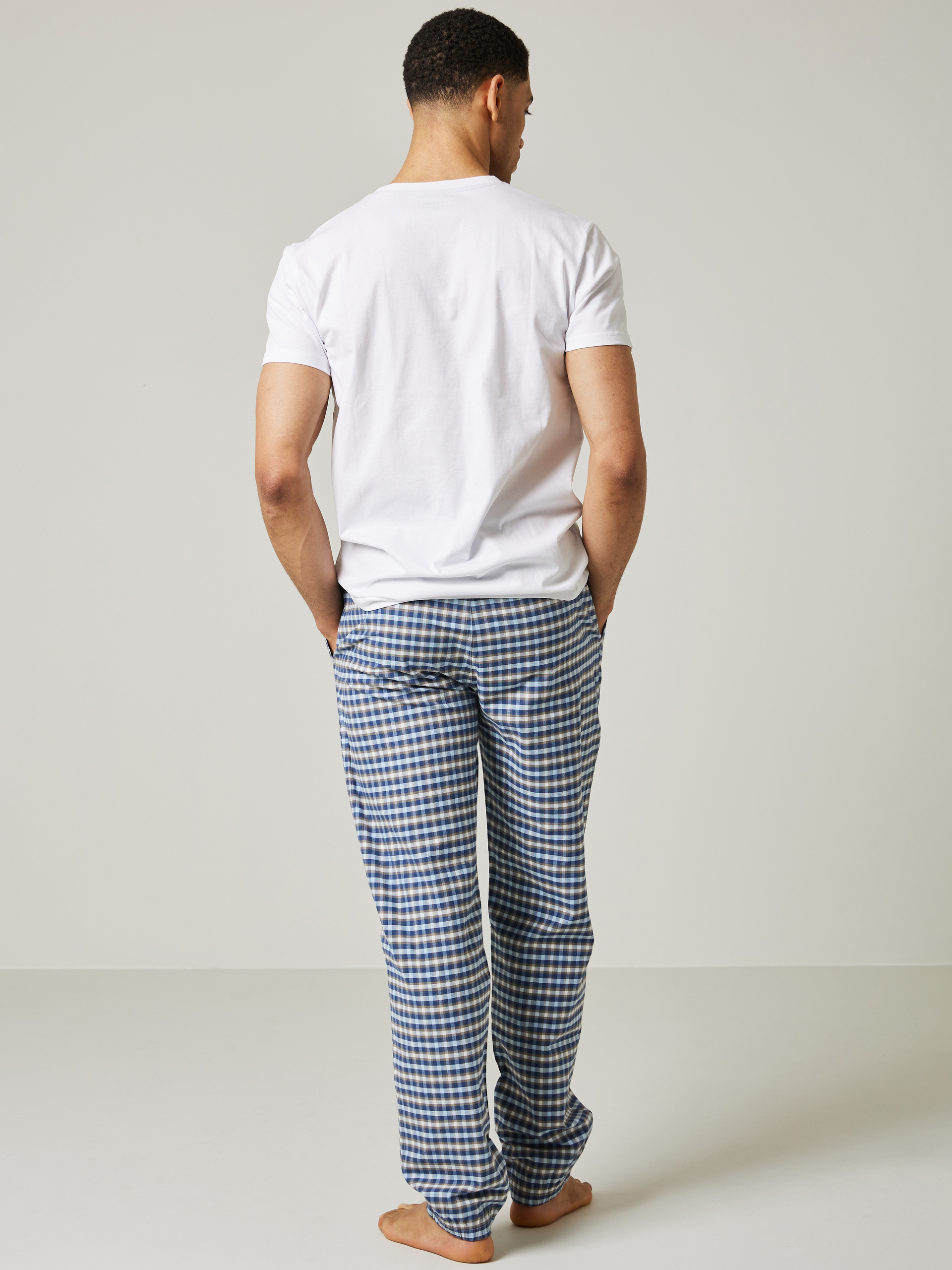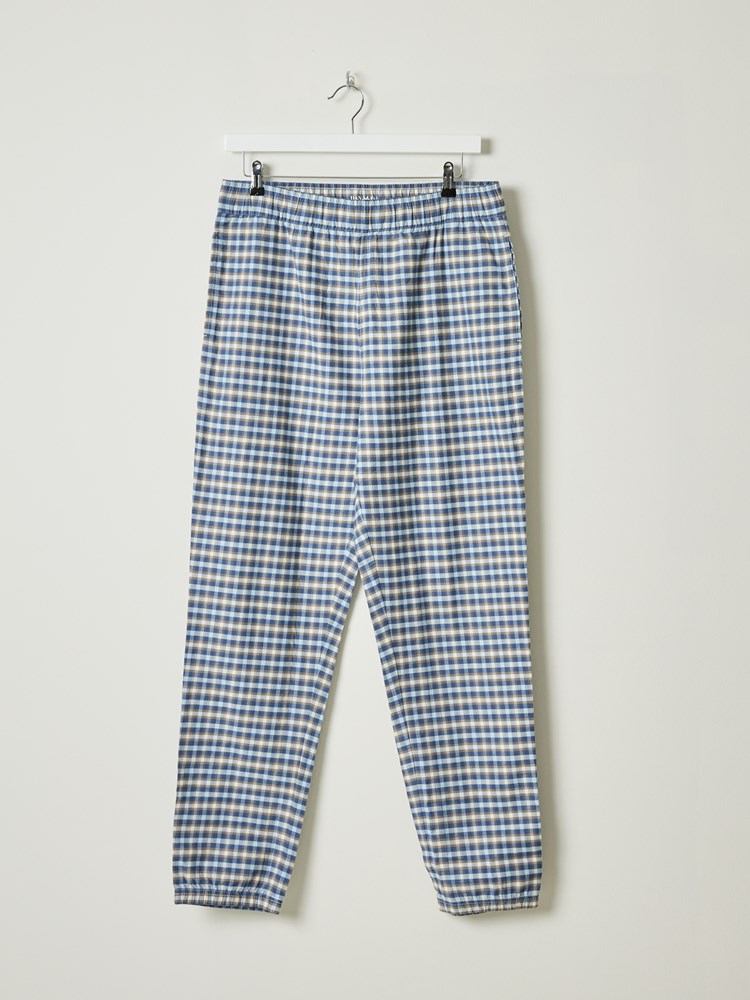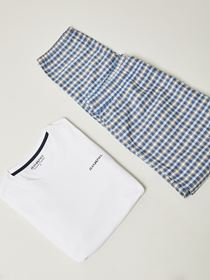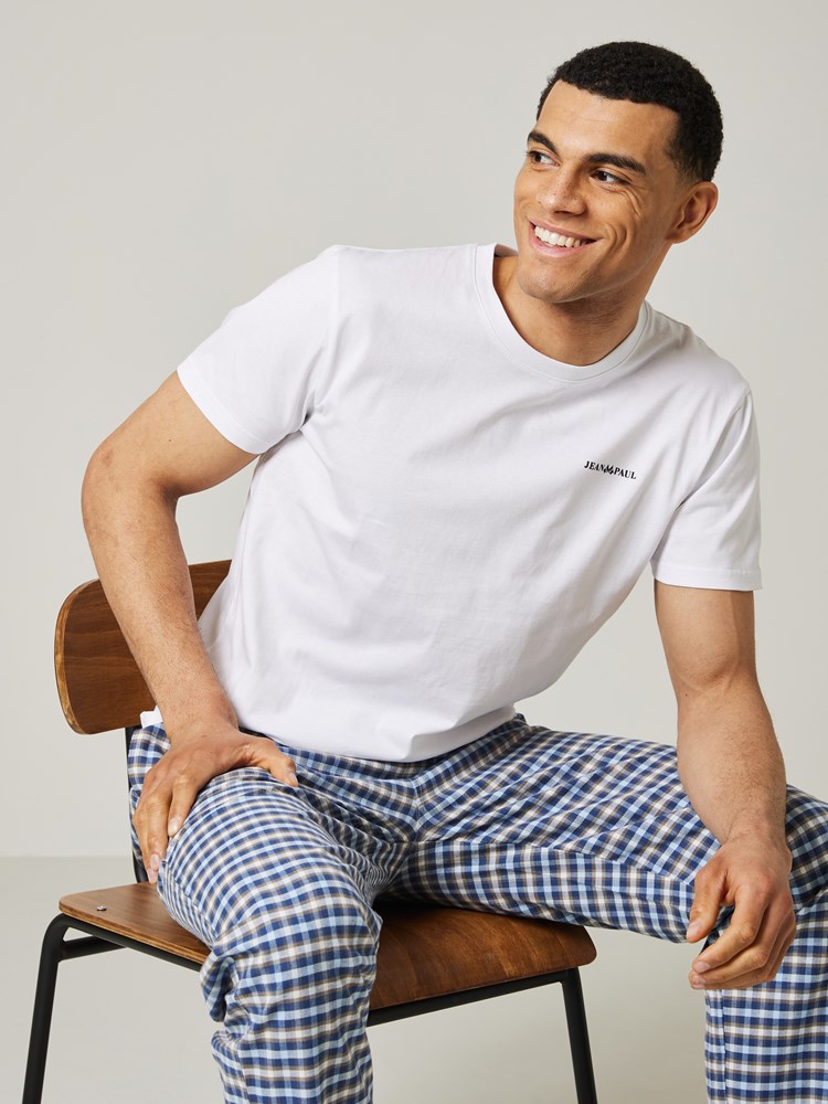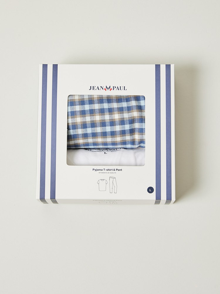 Pysjamassett med rutete bukse som har stikklommer og elastikk i livet og nederst i bena. T-skjorten er i myk bomull med kort erm, rund hals og har en liten printet logo på brystet. Modellen er 185 cm høy og bruker str L.