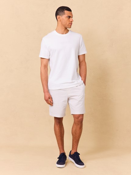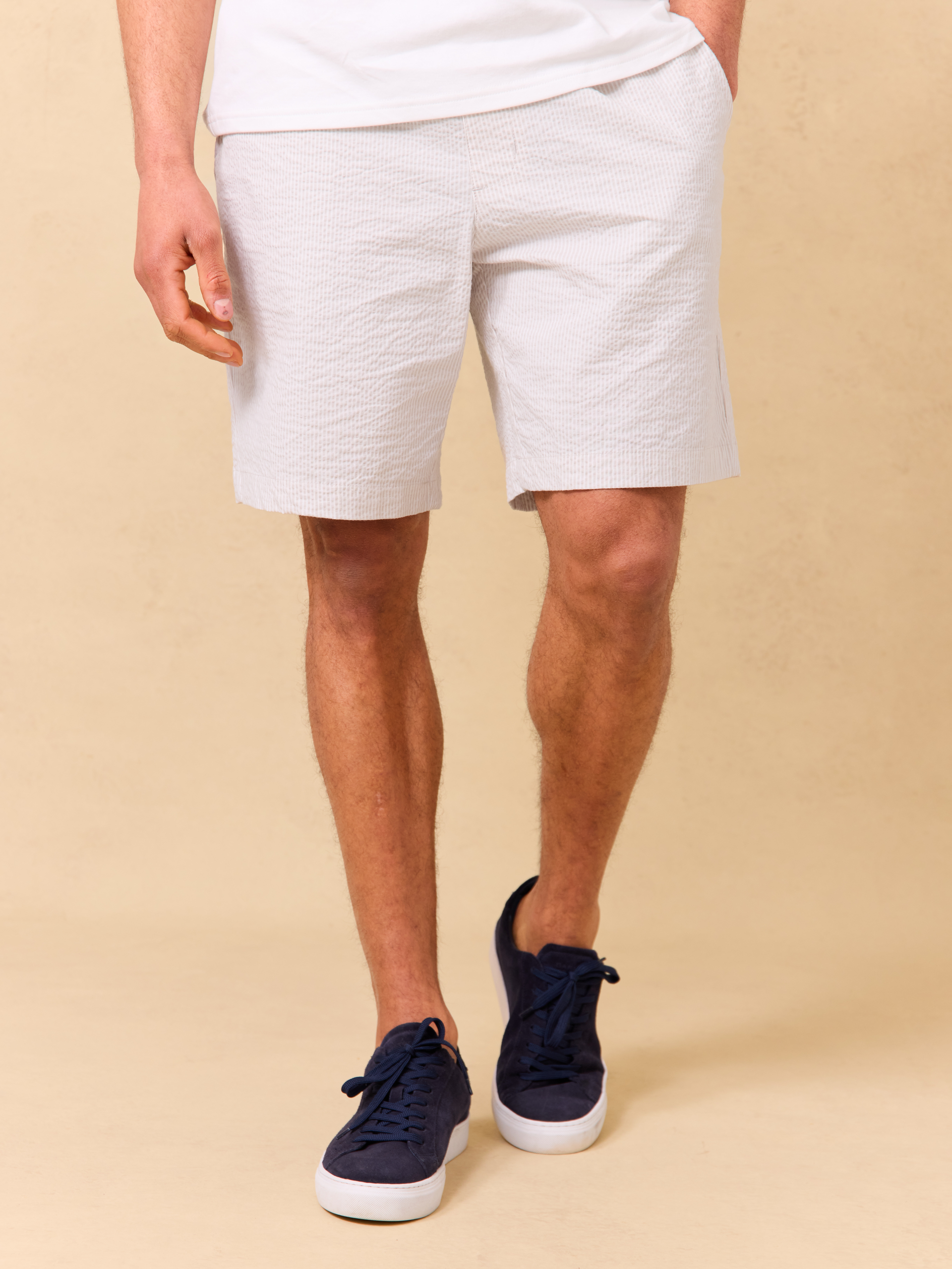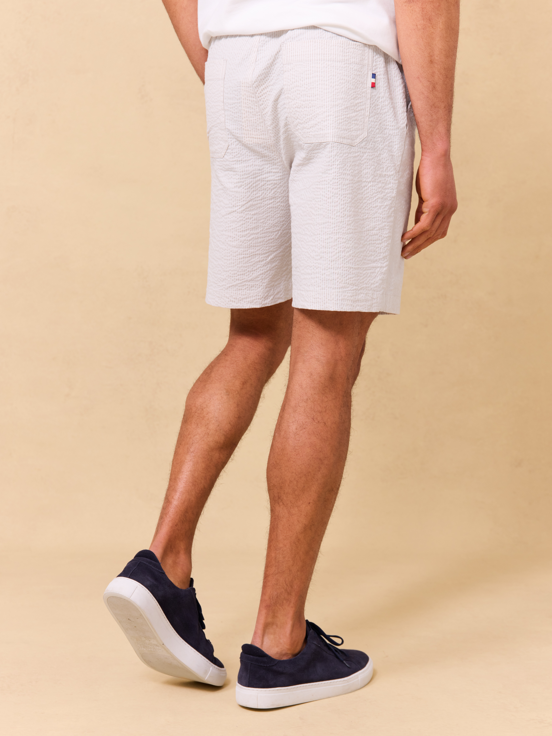 Stripet shorts i kreppet seersucker bomull. Shortsen har stikklommer, to baklommer hvorav en med en liten tab, samt elastikk og snøring i livet Klassisk passform.