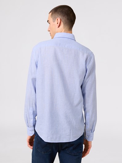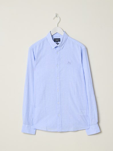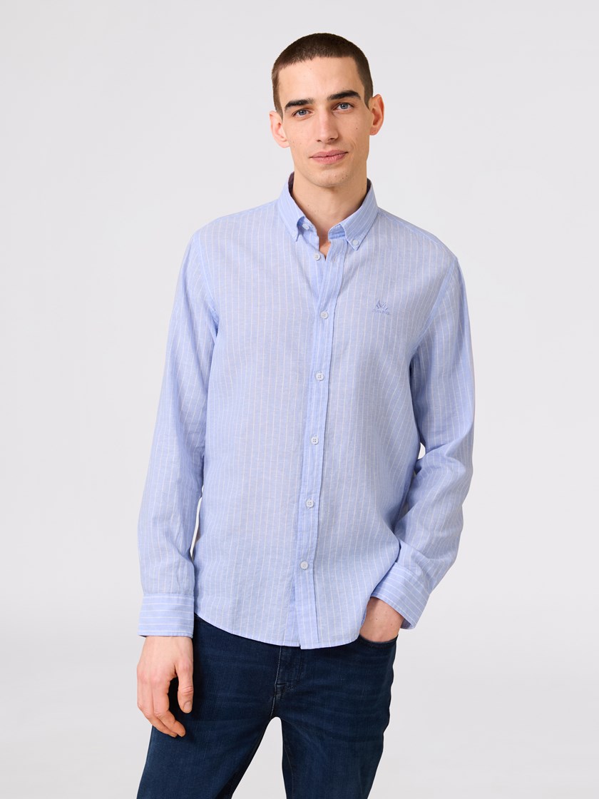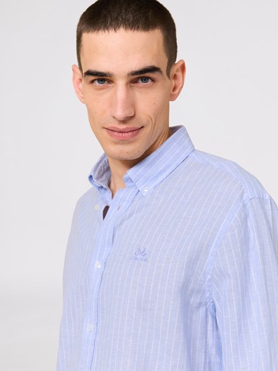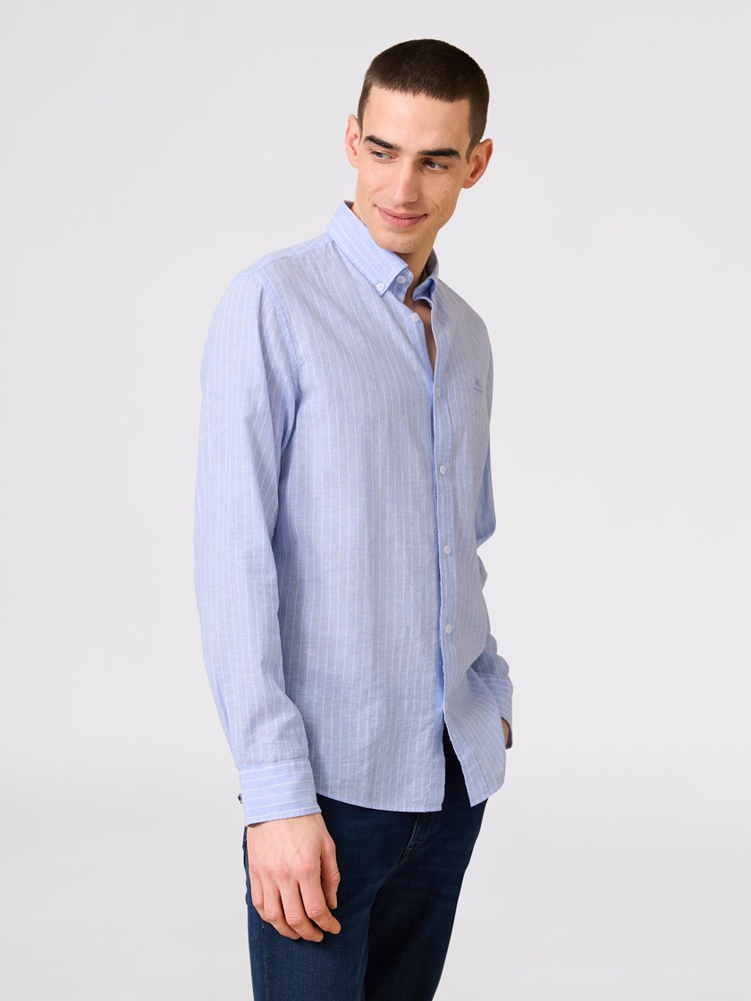 Skjorte med diskret stripe i lett og myk blanding av lin og bomull med ton i ton logo broderi på brystet. Skjorten har buttondown krage, sydd knappestolpe med lyse knapper, ensfarget stoff i nakke og mansjetten, bærestykke bak og mansjett med regulering. Regulær passform