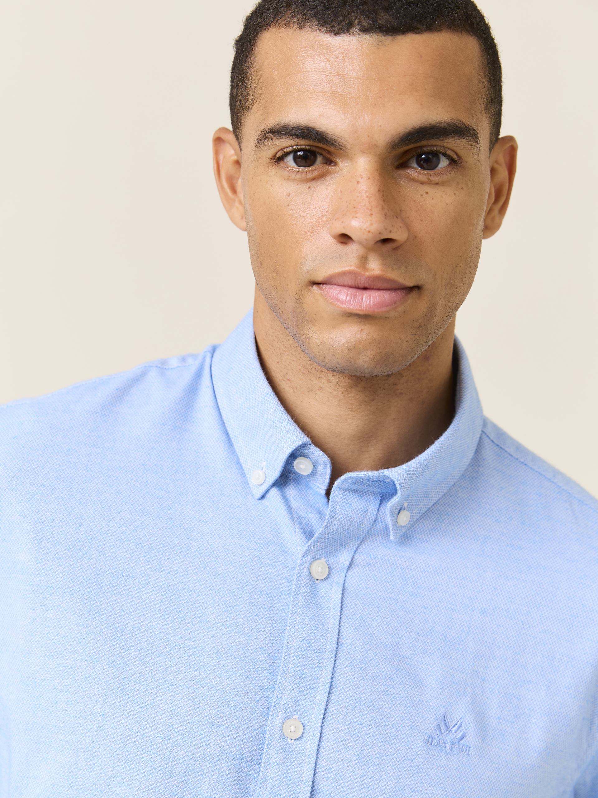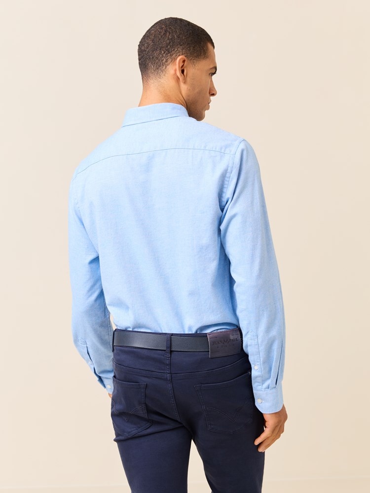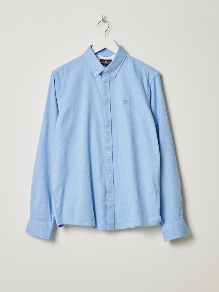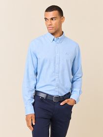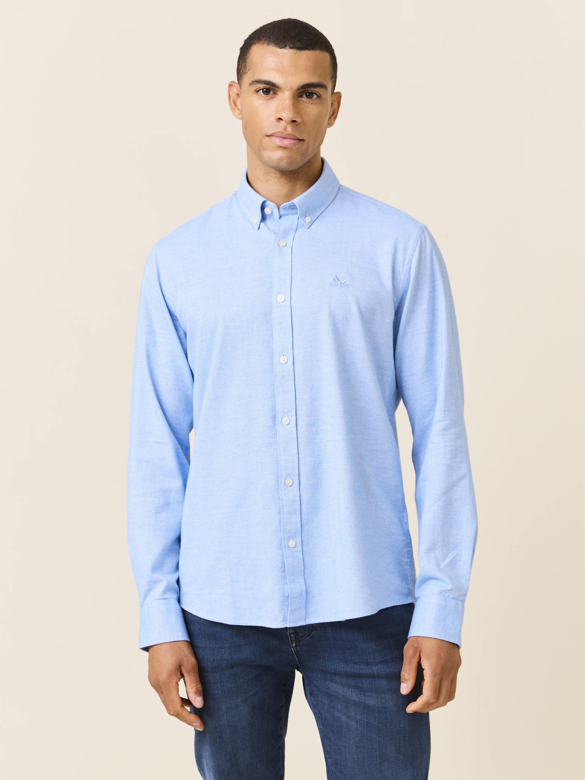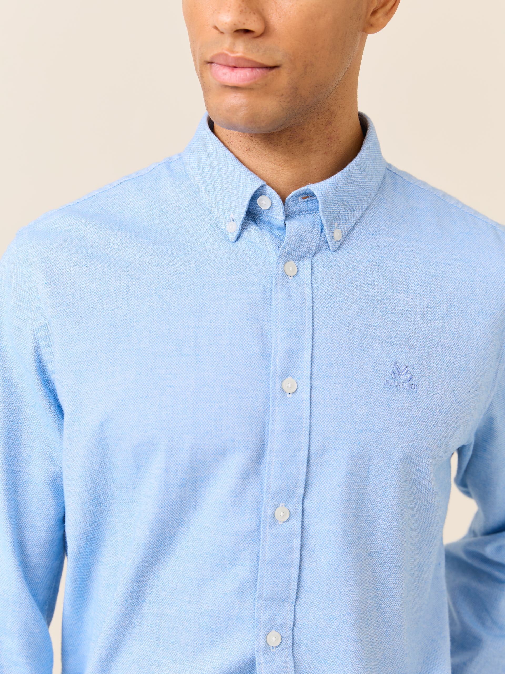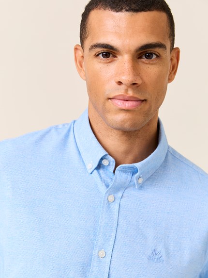 Klassisk skjorte i behagelig strukturvevet børstet bomull. Skjorten har lyse knapper, buttondown krage med innvendig nakkehempe, ton i ton broderi på brystet, regulerbar mansjett og kontrast-stoff inne i bærestykket bak. Modellen er 185 cm høy og har på seg str L.
