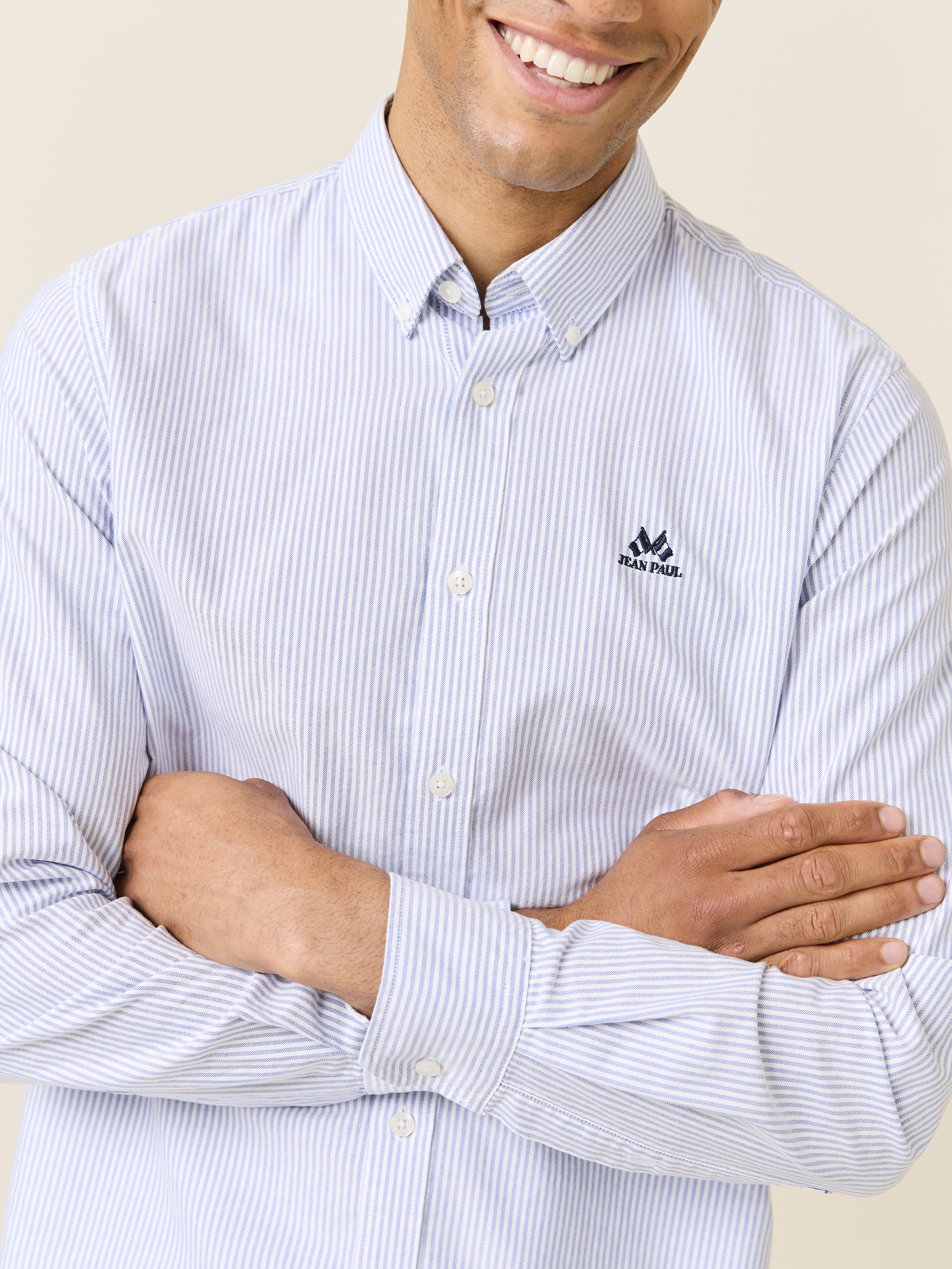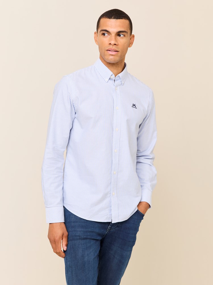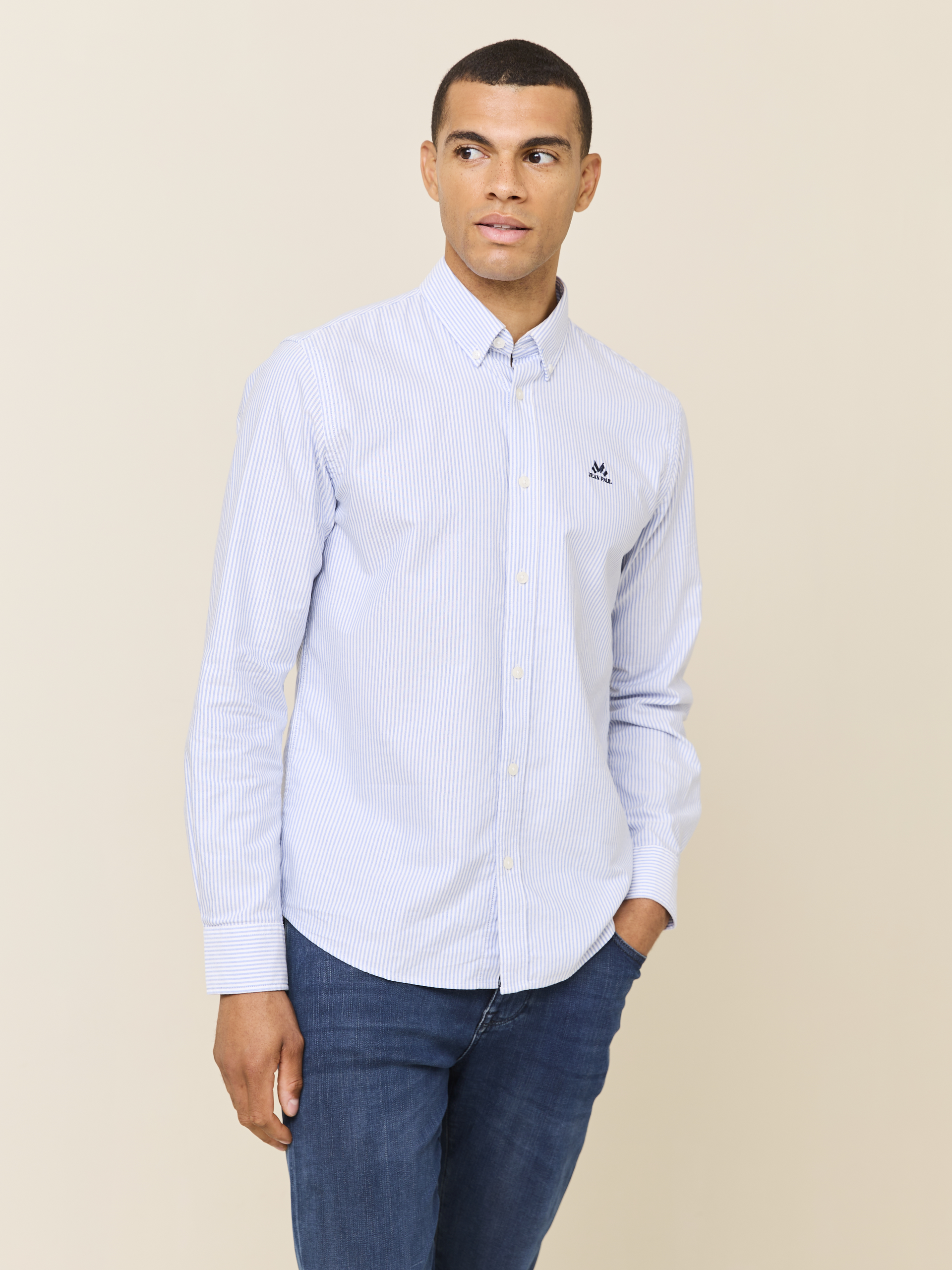 Klassisk stripete Oxford skjorte med lange ermer og regulerbar mansjett med knapp og splitt på ermet. Skjorten lukkes i front med knapper. Brodert logo på venstre bryst.