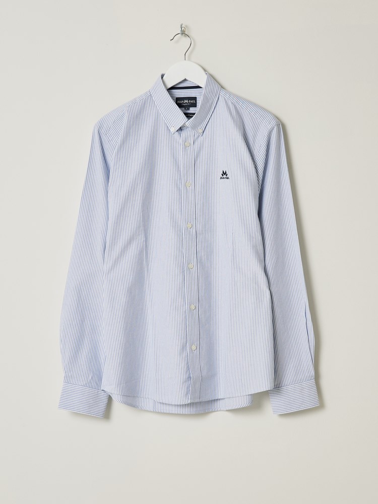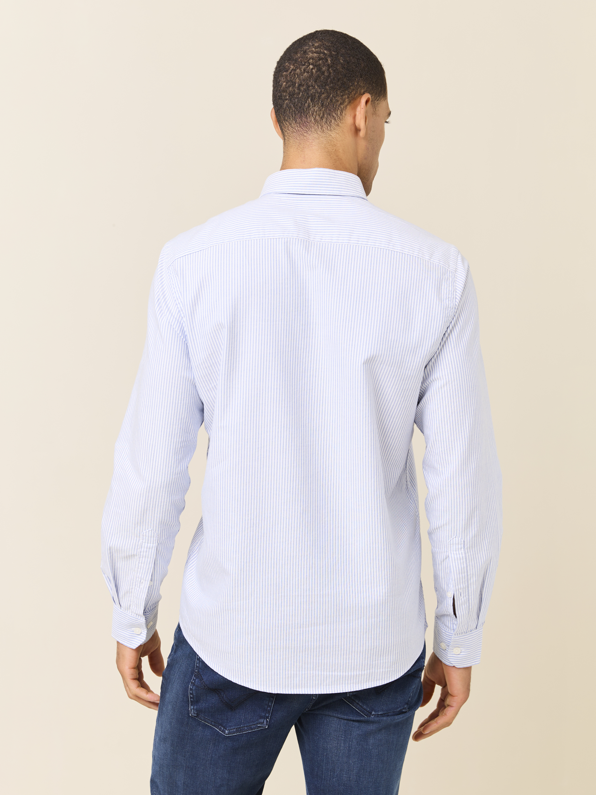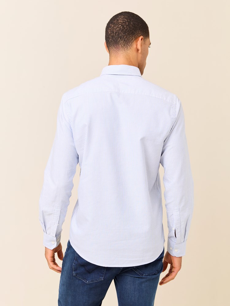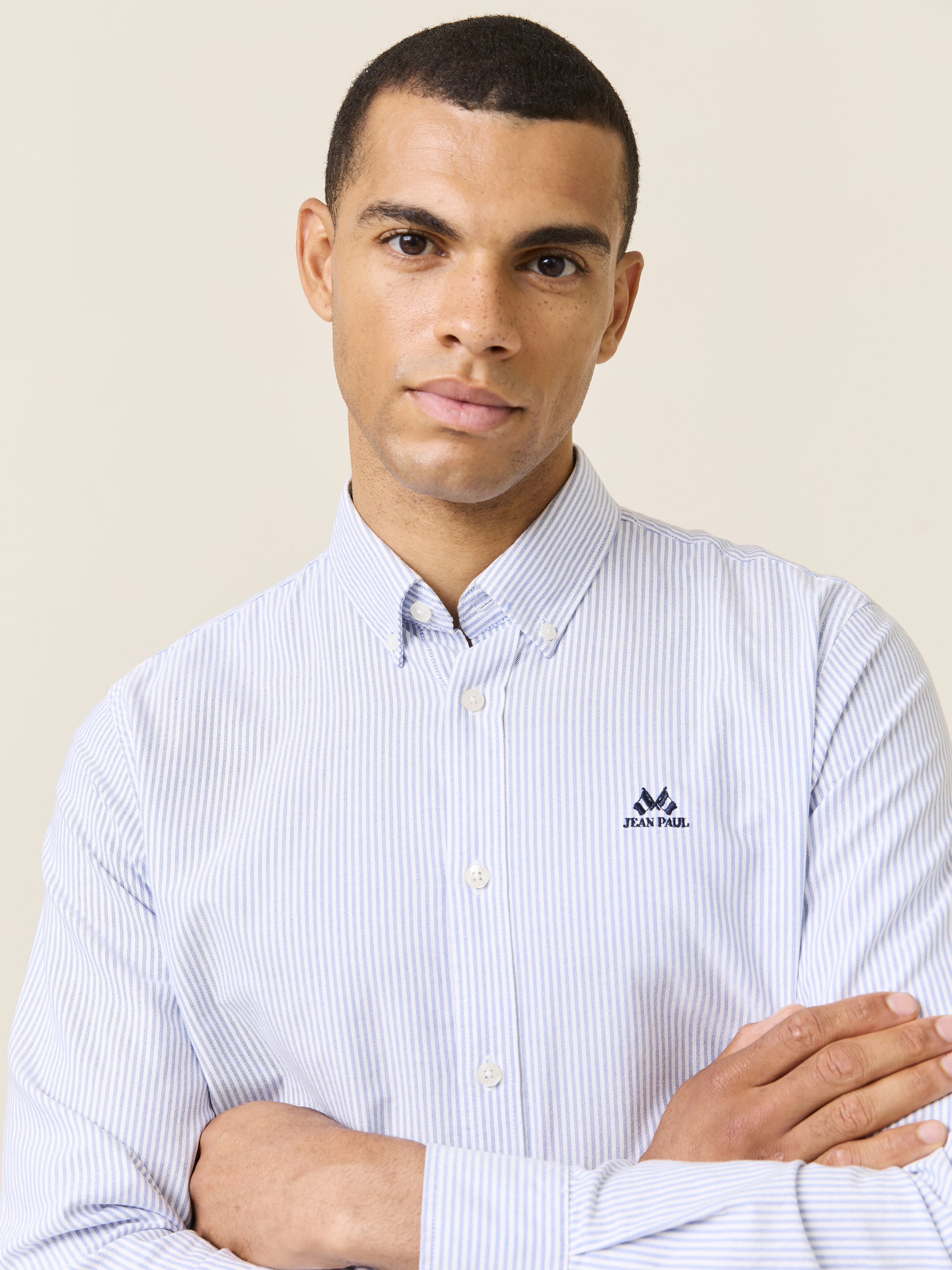 Klassisk stripete Oxford skjorte med lange ermer og regulerbar mansjett med knapp og splitt på ermet. Skjorten lukkes i front med knapper. Brodert logo på venstre bryst.