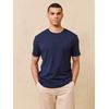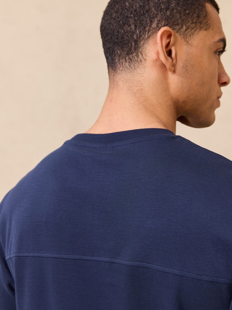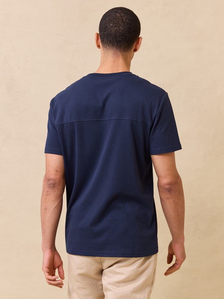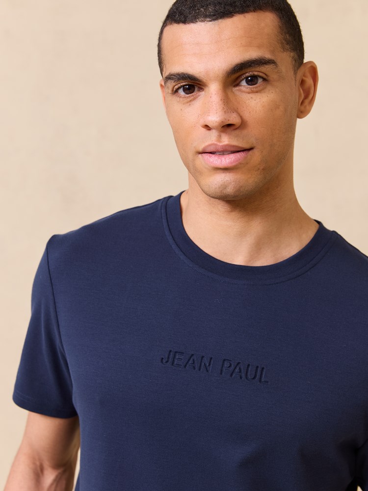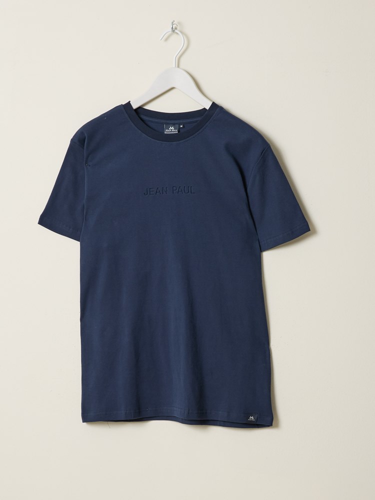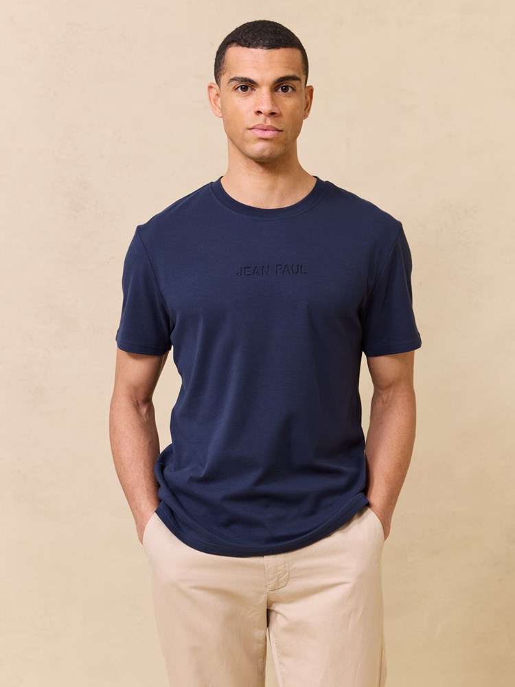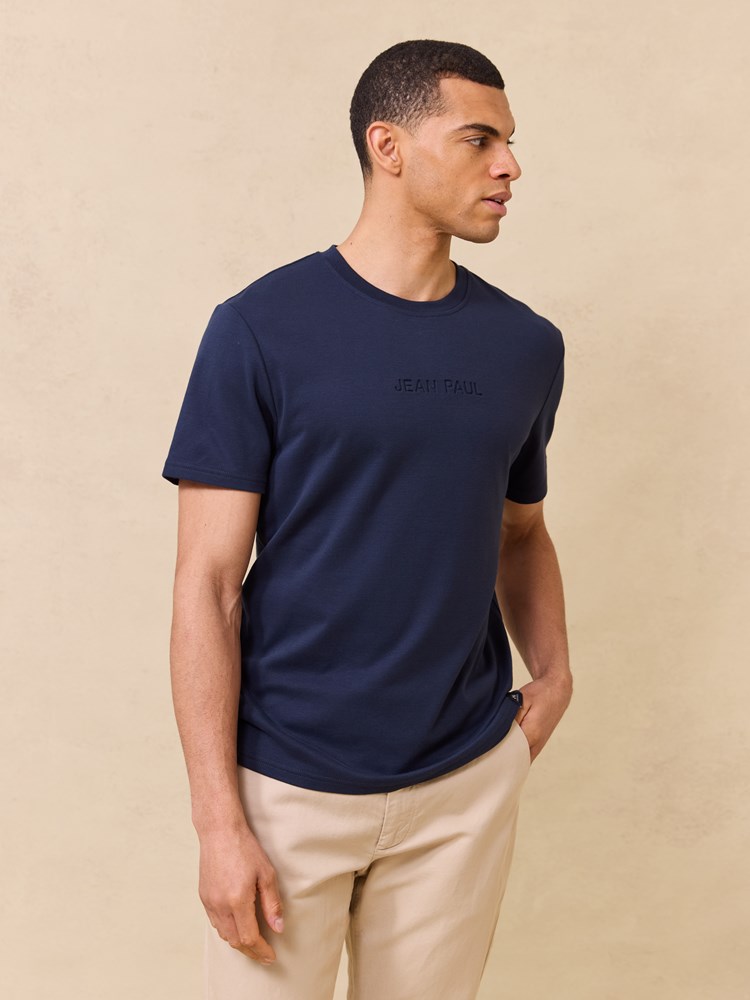 Kortermet t skjorte i myk børstet økologisk bomull med rund hals og regulær passform. T skjorten har en diskret preget logo på brystet og en liten logotab nede i siden. Modellen er 185 cm høy og har på seg str L.