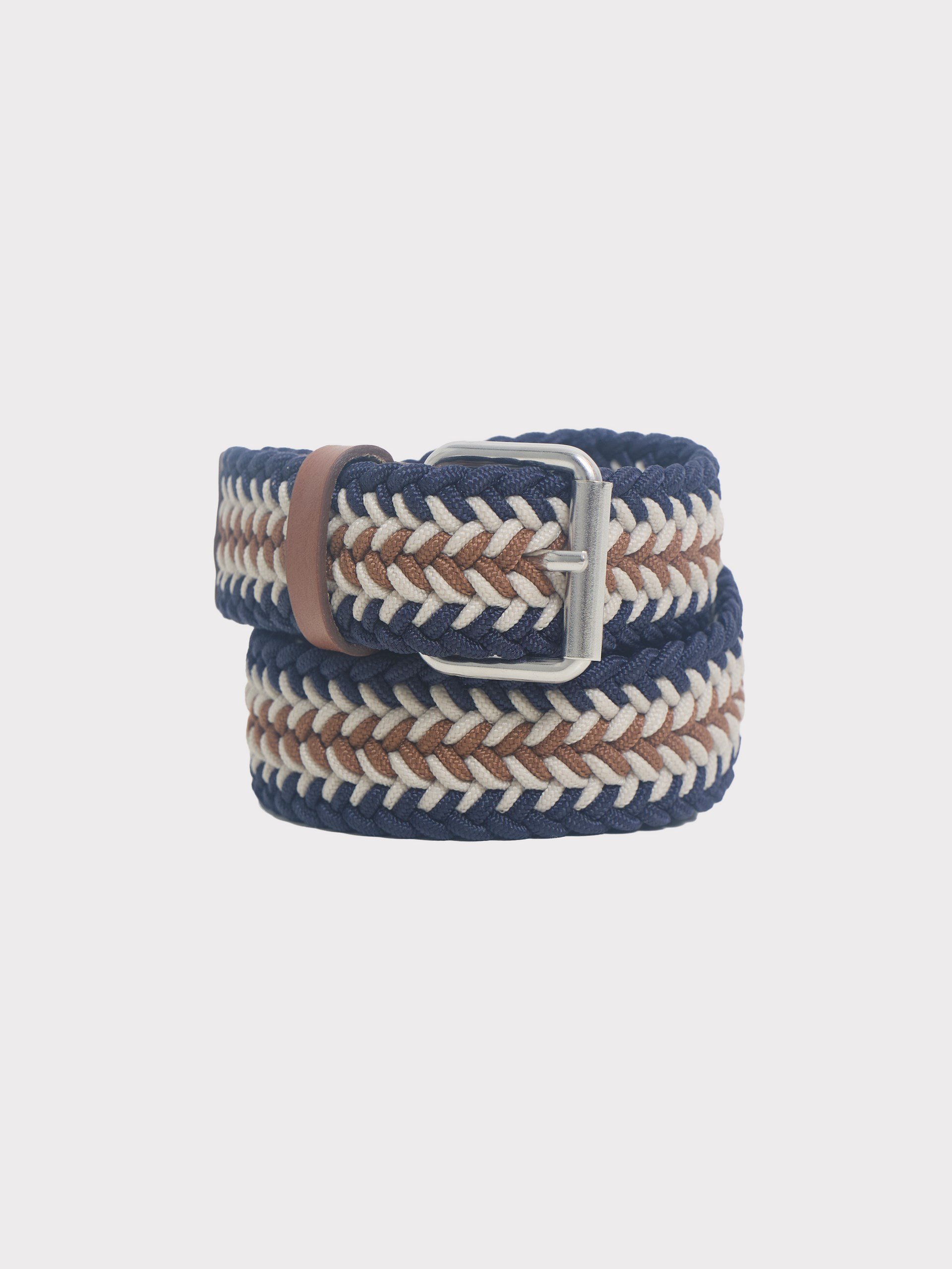 Flettet belte i flerfarget resirkulert polyester og elastan med detaljer i fullnarvet skinn